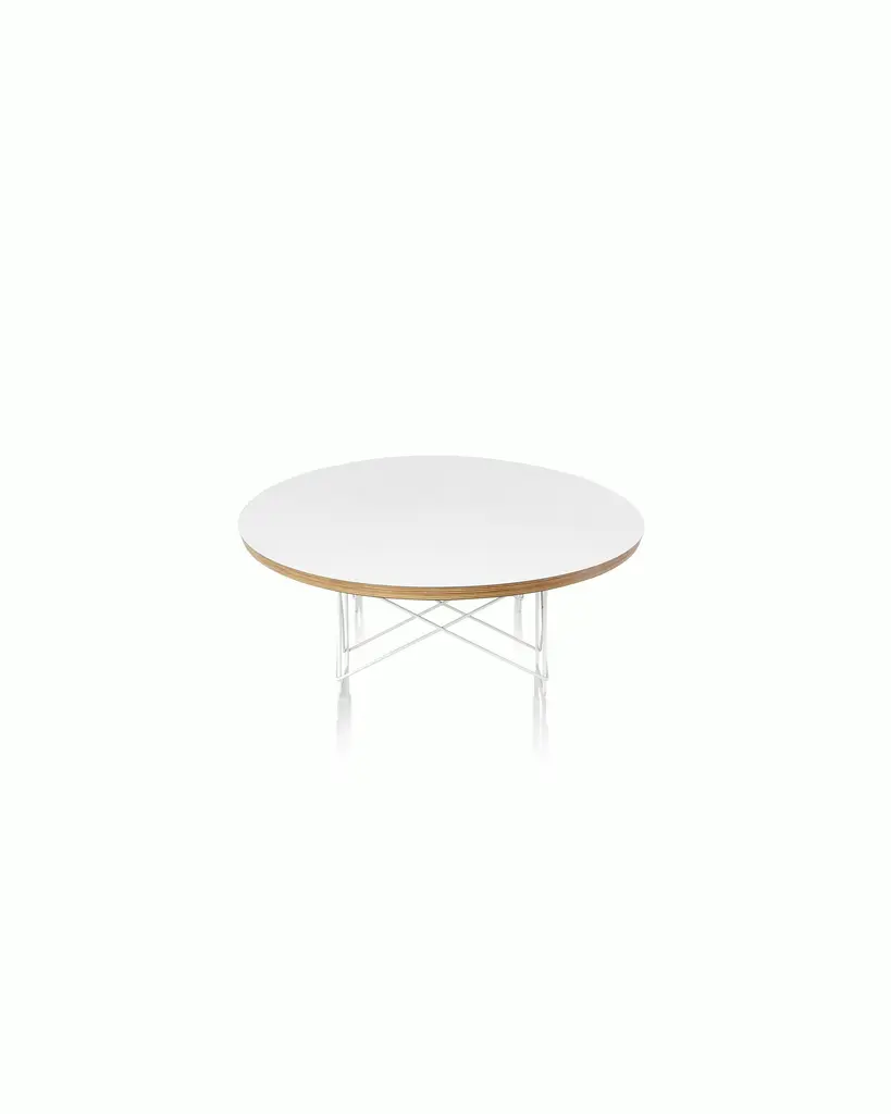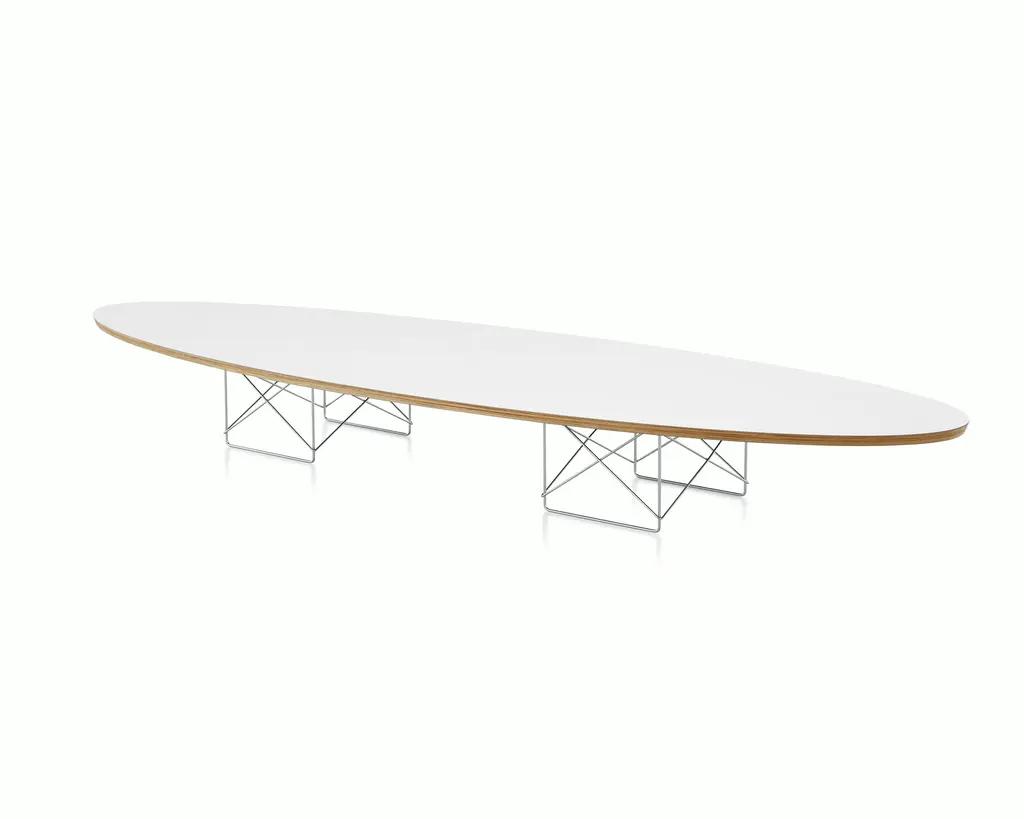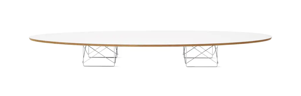 The Eames Elliptical Table (1951) makes a dramatic statement with 89 inches of table length. The top consists of seven layers of Baltic birch plywood, beveled at 20 degrees and sandwiched between high-pressure laminate. The signature wire-rod base comes in your choice of white, black, or trivalent chrome.