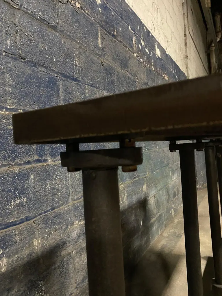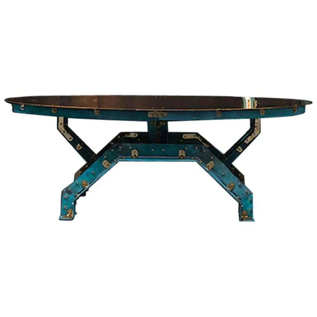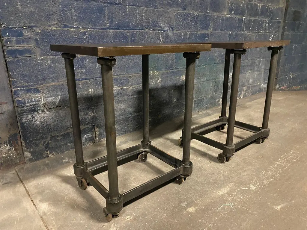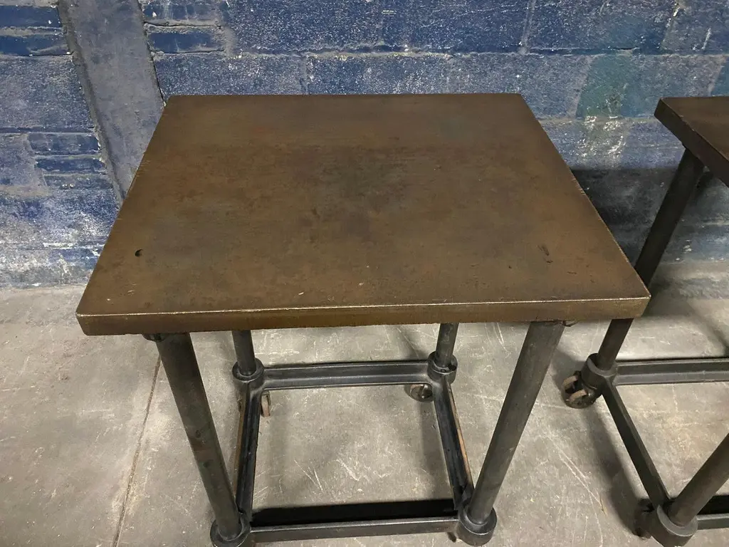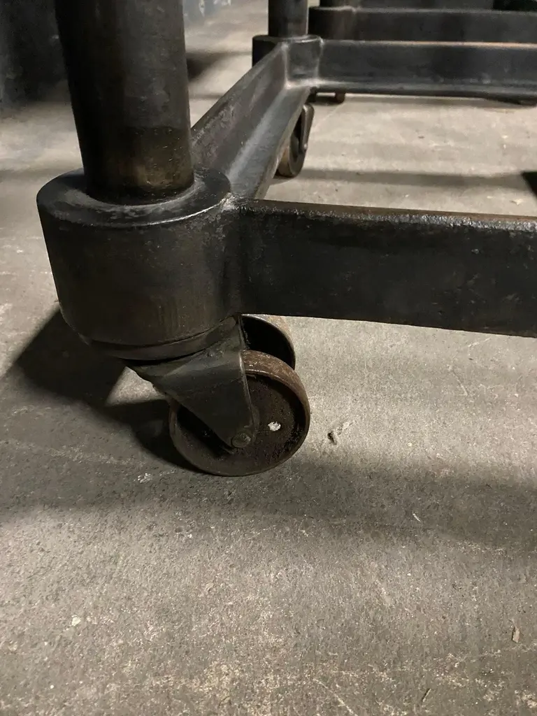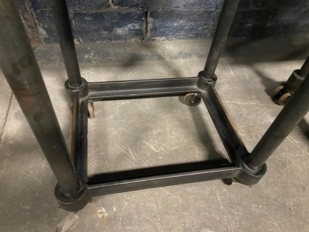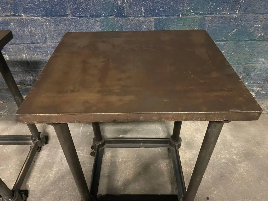 a pair of early 20th century Turtle tables from a defunct print shop. Excellent patina on these iron & steel tables. they are extremely heavy duty & would add gravity & a grounding element to any environment. sold as a single table with two being available. they measure 37" tall x 28" wide X 24" deep. they are mounted on the original heavy duty iron casters making them a breeze to move around.