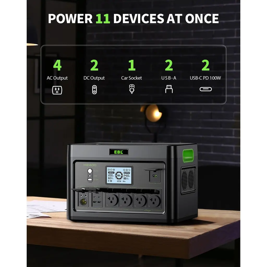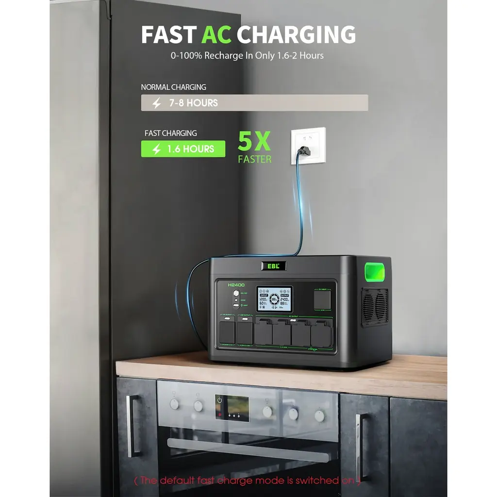 Our Product offers true capacity and exceptional performance with its powerful 2400W output and 1843.2Wh battery, making it ideal for powering a wide range of home appliances and outdoor equipment. Whether you're preparing for emergencies or heading off-grid, this power station delivers dependable energy when you need it most. Thanks to its ultra-fast AC charging, it reaches a full charge in just 1.6 to 2 hours—up to five times faster than standard power stations—so you're never left waiting. Built with a high-safety LiFePO4 battery, it provides over 3000 charge cycles, offering long-lasting durability, enhanced safety, and a more eco-friendly energy solution. Reliable, efficient, and ready for anything, the EBL 2400W is the ultimate power companion for modern living.