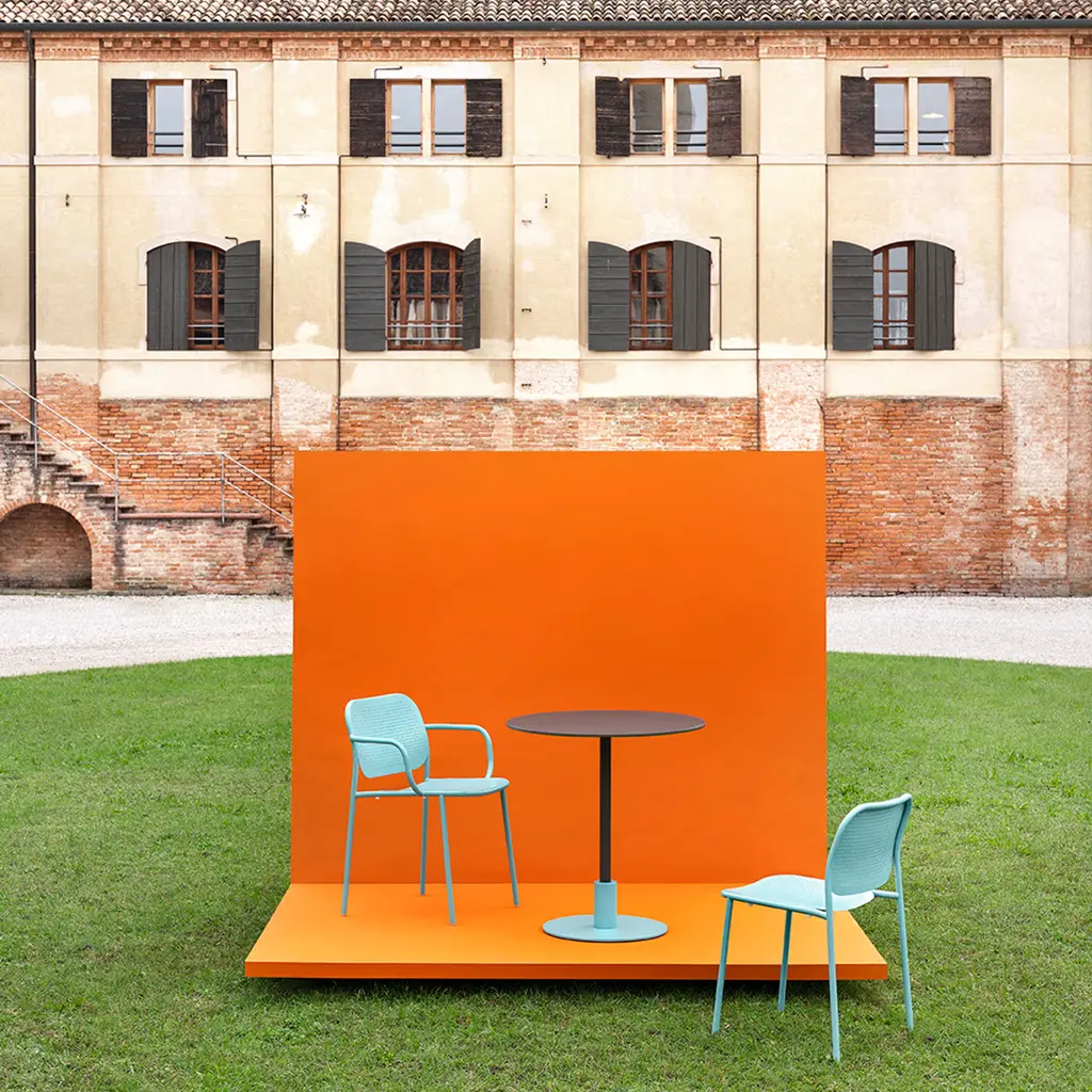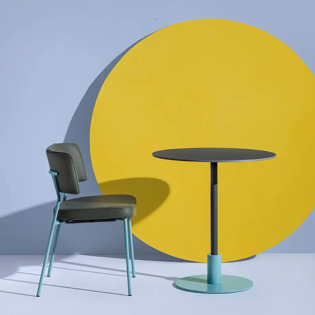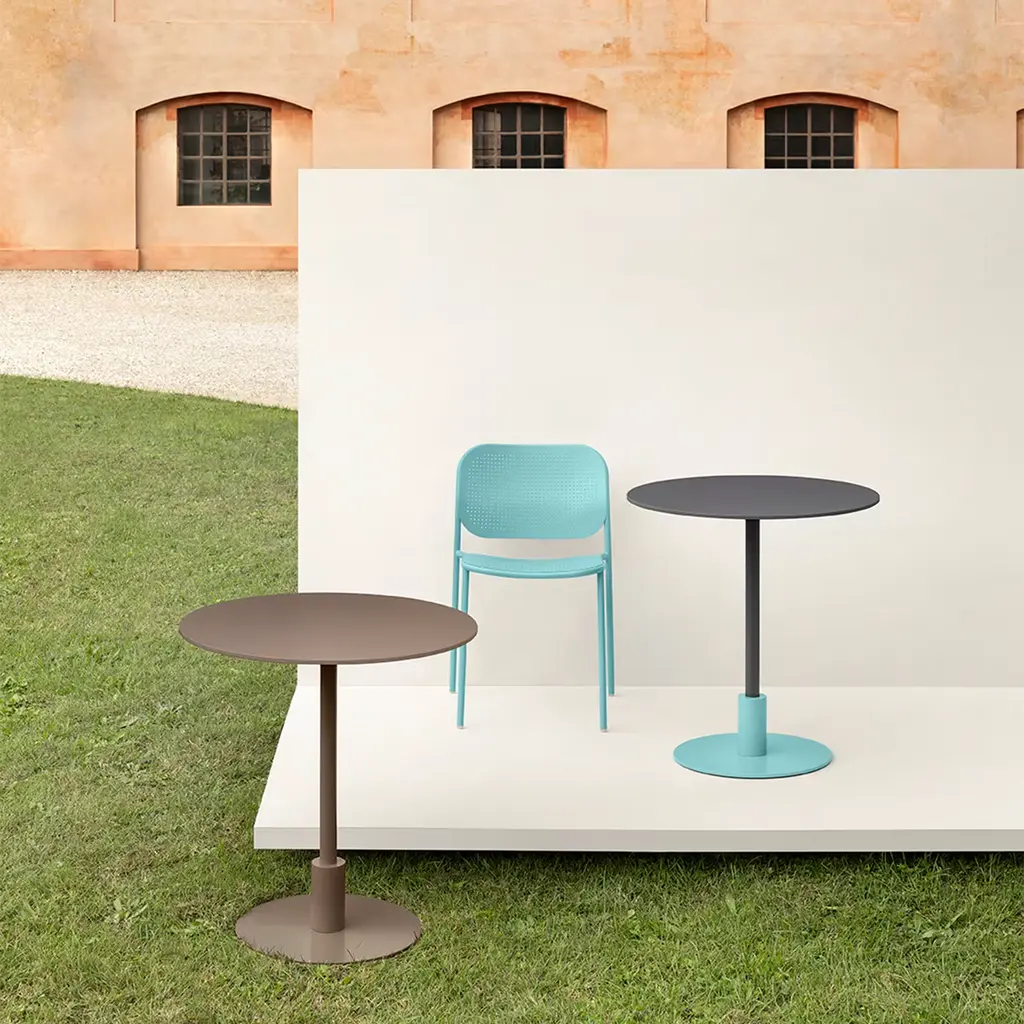 An unmistakable predilection for geometric minimalism characterizes this sleek round table by Gabbertas Studio. Stemming from cylindrical support in turn fitted to a disk-shaped base both finished in pastel turquoise (RAL 6034), the tubular leg shares with the round top the same elegant grey-green tone. The table is suitable for outdoor and indoor use. Please consult the Concierge for available shape and color variants.