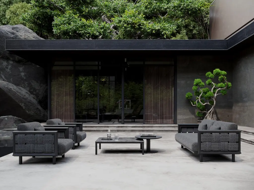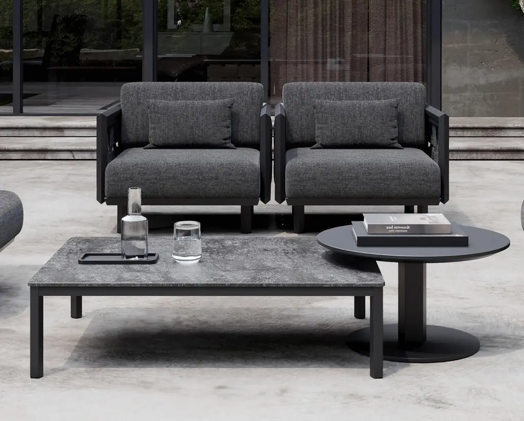 Éclat-Nightfall Aluminum Frame And Sintered Stone Round Coffee Table by SNOCDimensions: Ø 65 x H 36 cm.Materials: Aluminium and Sintered stone.Anthony Spon-Smith, a visionary in modern design, creates furniture that transcends traditional boundaries. In the Éclat Collection, he showcases his mastery in seamlessly blending form and function. Each piece, constructed with an aluminum frame and rope, achieves a perfect balance of strength and elegance. This combination not only produces visually stunningdesigns but also ensures durability and comfort. Spon-Smith’s design philosophy is deeply rooted in a profound understanding of the spaces his creations will inhabit. This collection is meticulously crafted to elevate environments, making them both inviting and refined.SnocSince their foundation in 2004, SNOC’s history has been interwoven with that of international design. Each chapter written with care, each product reflecting its passion. The company understands that a real story exists behind each object and behind that story, a real person desiring something more. Their ever-developing methodology focuses on defining the core of a brand and utilizing those characteristics to help nurture its soul, aiding in forging real connections. This approach , results in their unique “work in progress” style: original, versatile solutions that in their signature blend of sound, vision and design best-suit every environment and situation, arousing a range of emotions on a daily basis as well as standing the test of time.Driven by functional research, an inclusive project and product culture, and deep care for the environment, we exist as the timeless yet present essence of outdoor furniture design elevating private and public space a like with thoughtfully presented, endlessly adaptive creations.