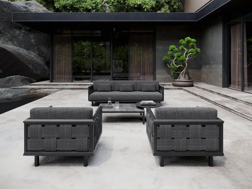 Éclat-Nightfall Aluminum Frame And Sintered Stone Tabletop Coffee Table by SNOCDimensions: D 80 x W 110 x H 29 cm.Materials: Aluminium and Sintered stone.Anthony Spon-Smith, a visionary in modern design, creates furniture that transcends traditional boundaries. In the Éclat Collection, he showcases his mastery in seamlessly blending form and function. Each piece, constructed with an aluminum frame and rope, achieves a perfect balance of strength and elegance. This combination not only produces visually stunningdesigns but also ensures durability and comfort. Spon-Smith’s design philosophy is deeply rooted in a profound understanding of the spaces his creations will inhabit. This collection is meticulously crafted to elevate environments, making them both inviting and refined.SnocSince their foundation in 2004, SNOC’s history has been interwoven with that of international design. Each chapter written with care, each product reflecting its passion. The company understands that a real story exists behind each object and behind that story, a real person desiring something more. Their ever-developing methodology focuses on defining the core of a brand and utilizing those characteristics to help nurture its soul, aiding in forging real connections. This approach , results in their unique “work in progress” style: original, versatile solutions that in their signature blend of sound, vision and design best-suit every environment and situation, arousing a range of emotions on a daily basis as well as standing the test of time.Driven by functional research, an inclusive project and product culture, and deep care for the environment, we exist as the timeless yet present essence of outdoor furniture design elevating private and public space a like with thoughtfully presented, endlessly adaptive creations.