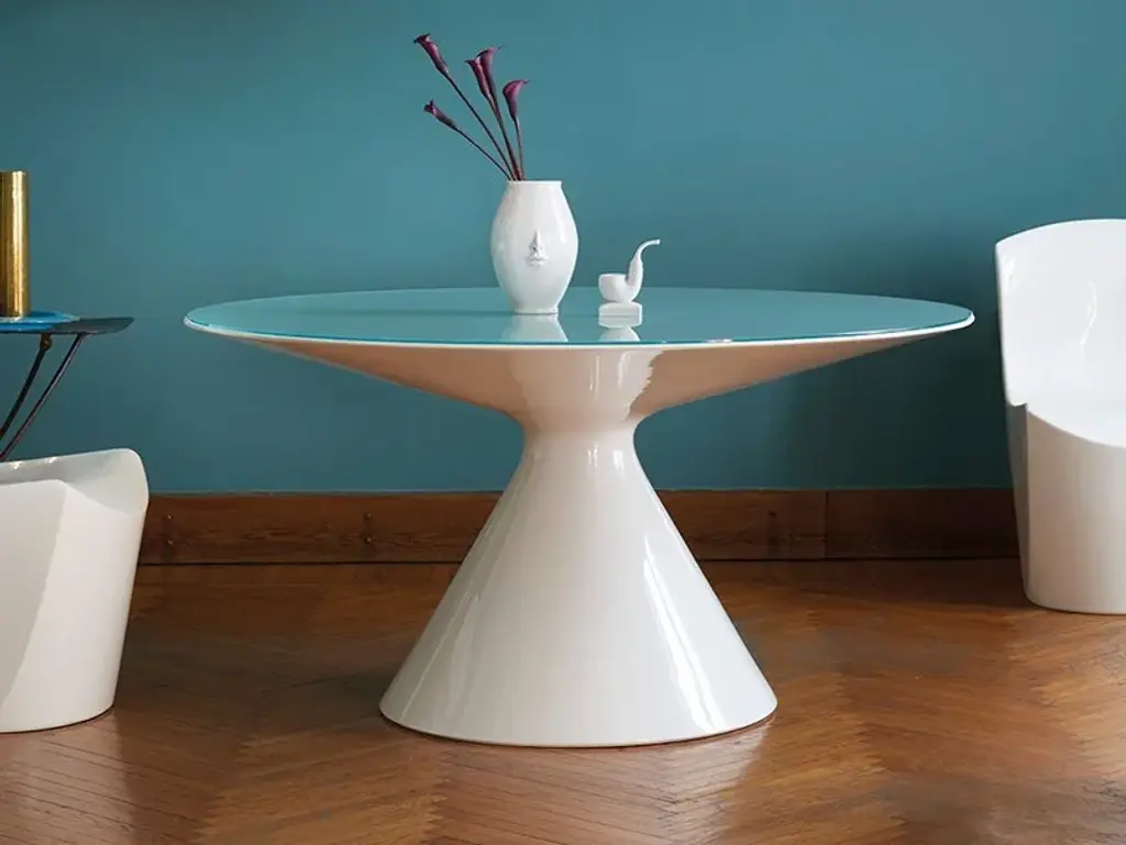 Ed is a luminous table and it is the perfect mix between different shape and materials: its base is conical and made in polyethylene, its top is round and it is in tempered glass. Thanks to its linear and essential design, Ed could be adapted in every kind of indoor or outdoor settings, for contract, events and private houses. The contemporary lighting base makes richer its elegant design, so Ed is an ideal actor to impress your guests. Ed has become a best seller of the whole Slide production, thanks to its dim light, its glass top and its essential design.Oval or round top.Versions:- standard- lacquered- with light E27 - 4 x 10W- LED: RGBW LED module with rechargeable battery