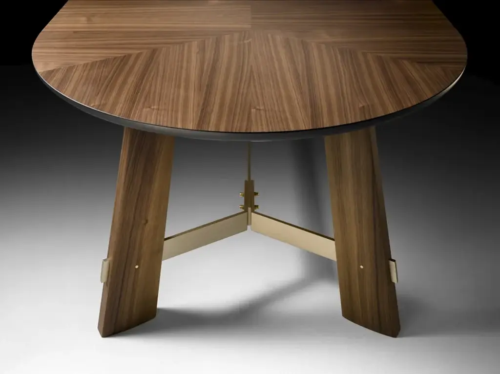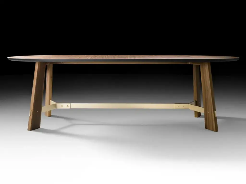 Edison is an oval walnut and MDF table.Canaletto walnut supporting structure, top in MDF Canaletto walnut. Matt gold finishing metal base.Ellipse is a geometric place of equilibrium, within which the points of two circumferences, called foci, interact in harmony: Edison was born from here, from the purity of the geometric form, made stable and tangible by the legs in Canaletto walnut or Ash moka solid wood. The footrest in matt gold finishing underlines and harmonises the elegance of this table, which fits with refined simplicity into living, contract and office environments.