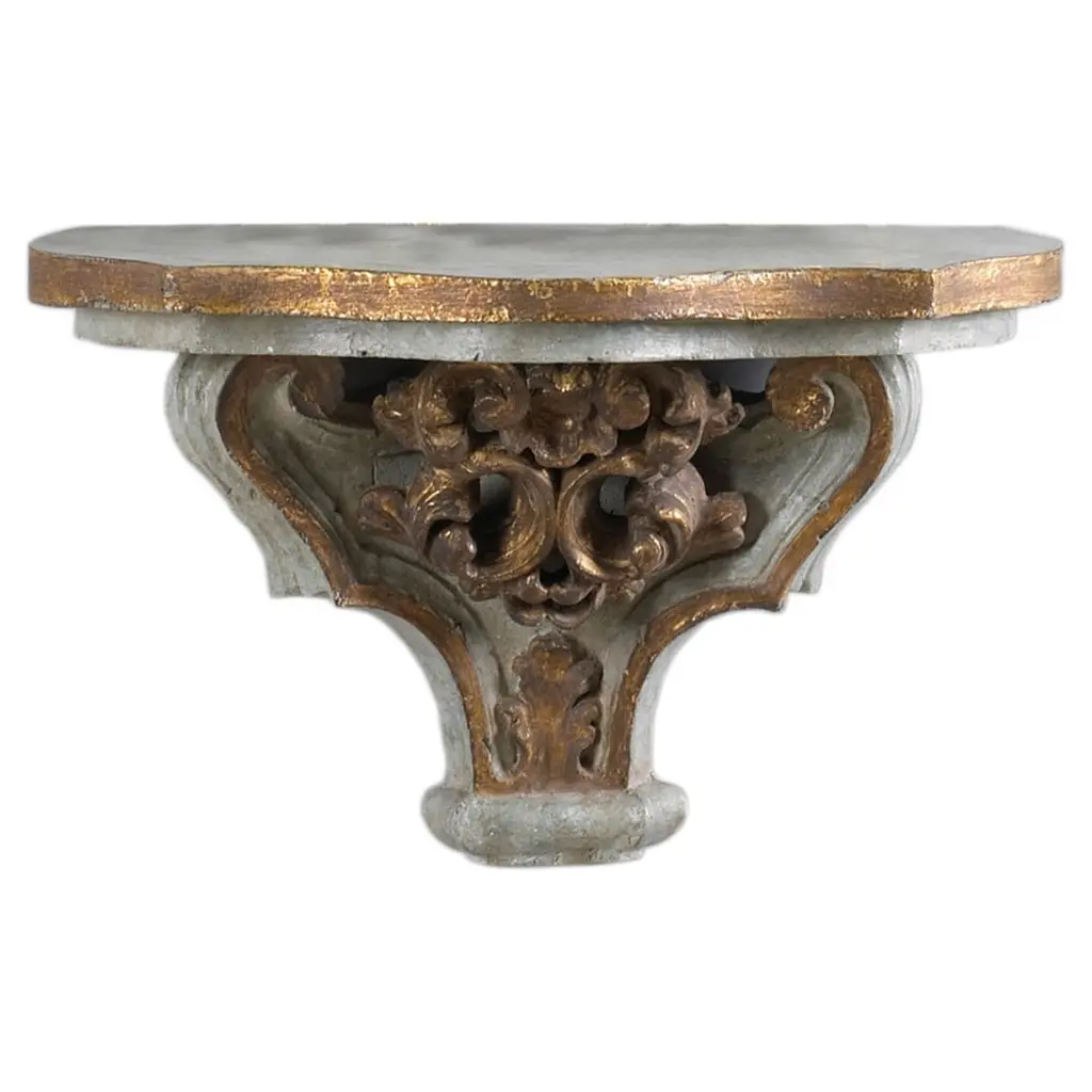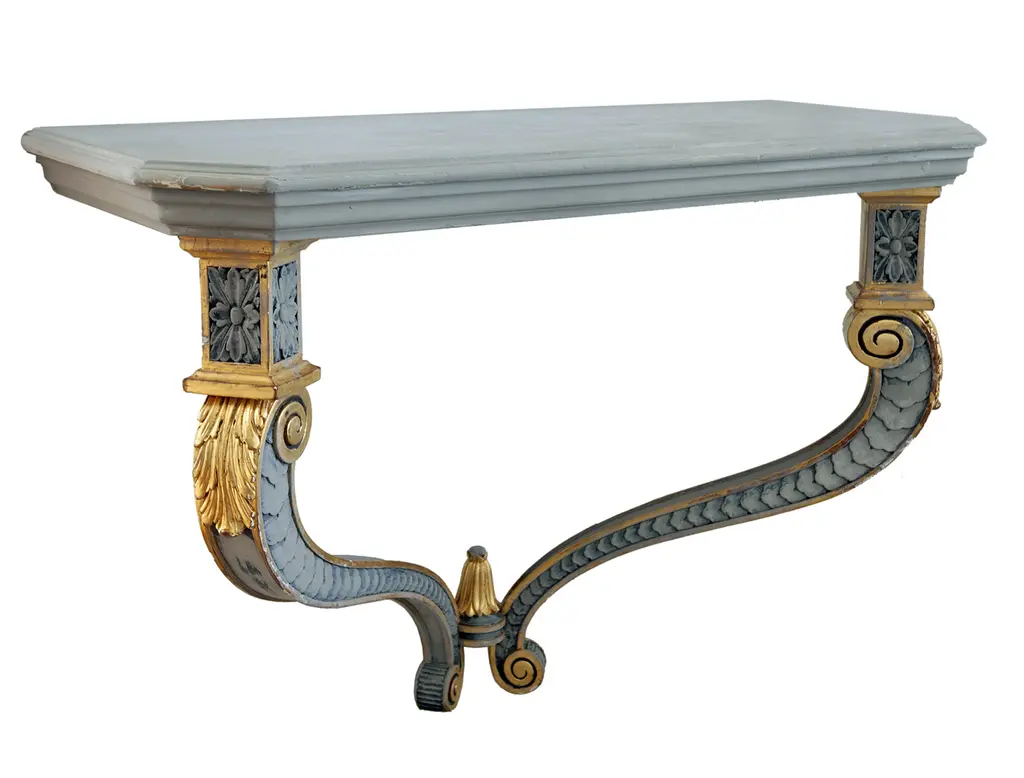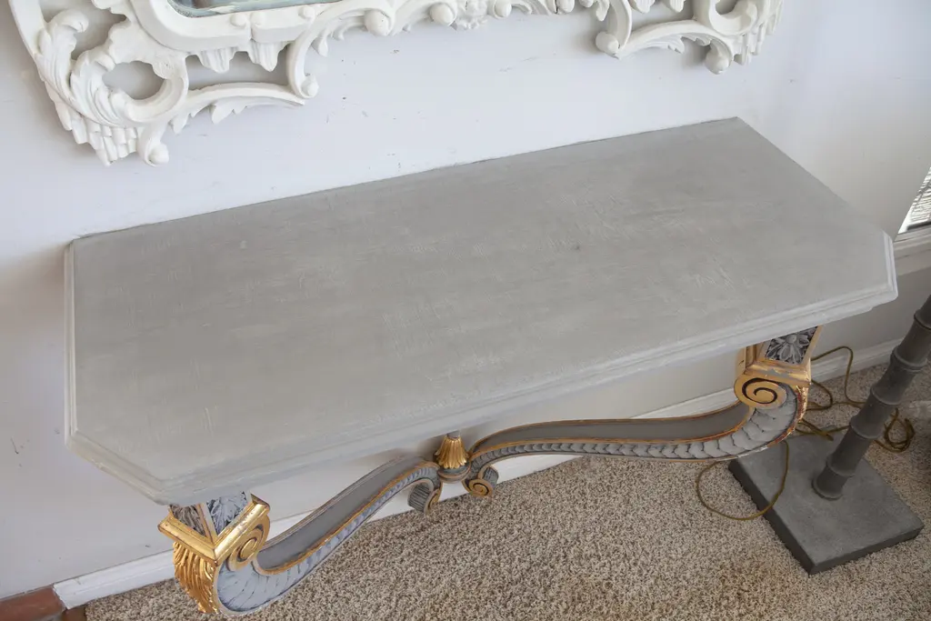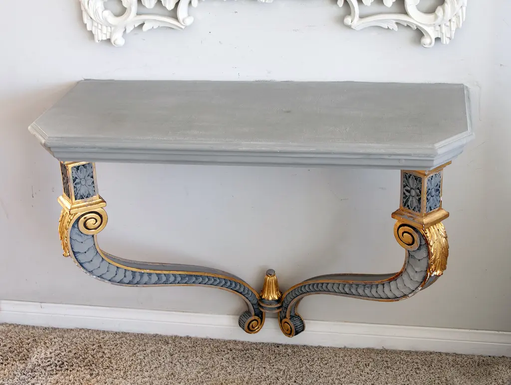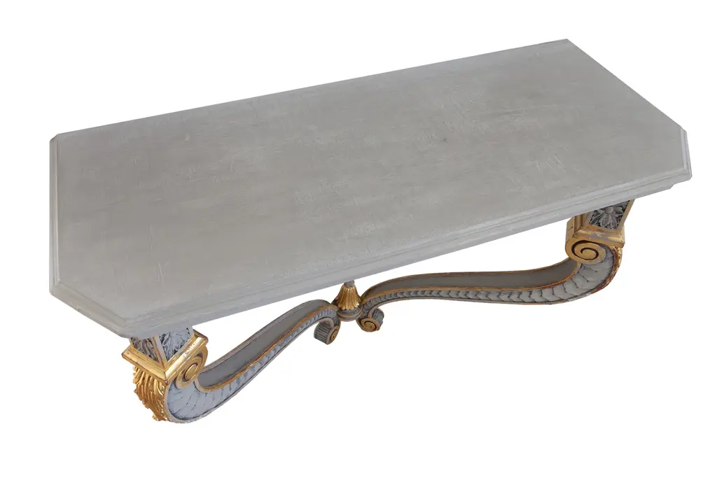 20th Century Egyptian Revival wall mounted console table. Handcrafted & handcarved. This piece features a hand-painted greige finish accented with gilt trim. Wall mount, easy to hang, ready to install.