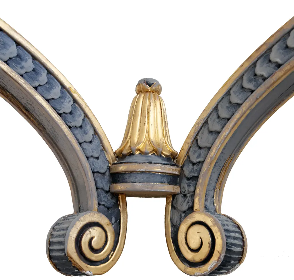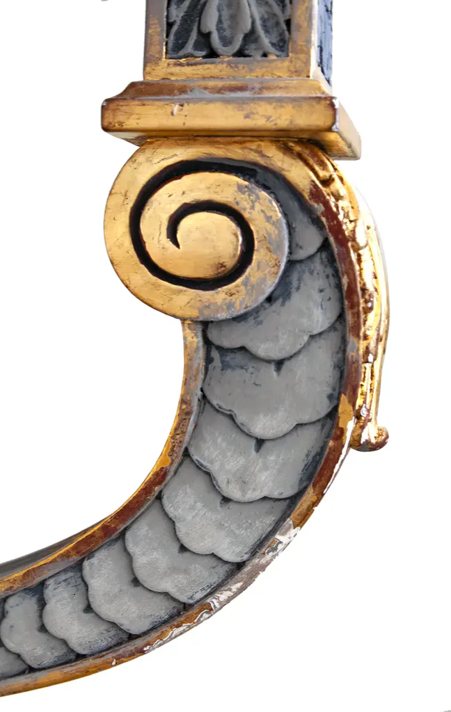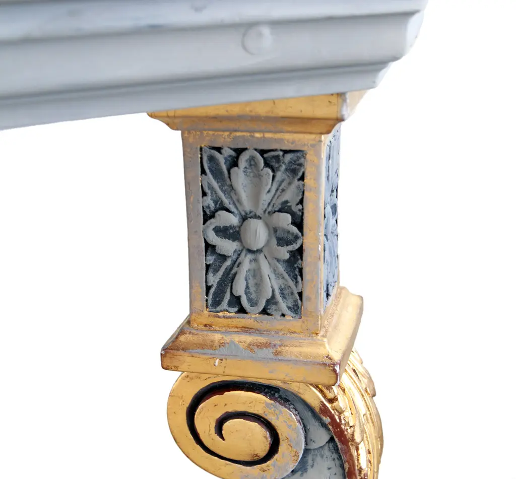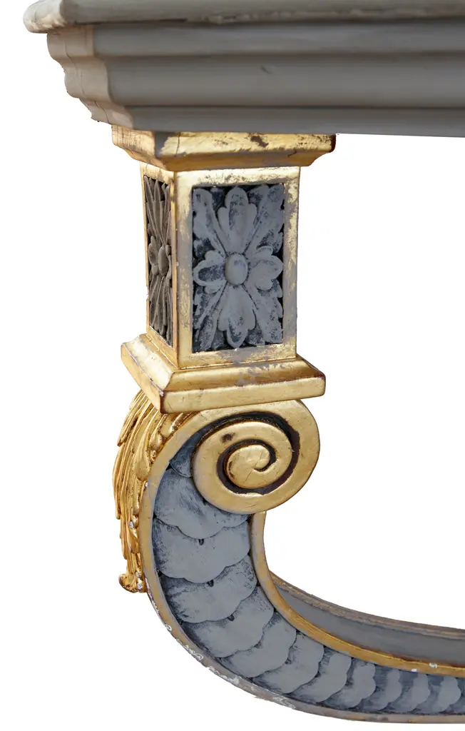 20th Century Egyptian Revival wall mounted console table. Handcrafted & handcarved. This piece features a hand-painted greige finish accented with gilt trim. Wall mount, easy to hang, ready to install.