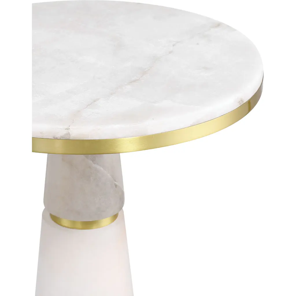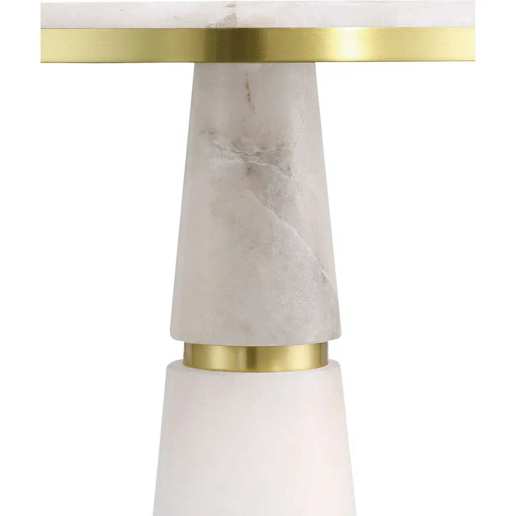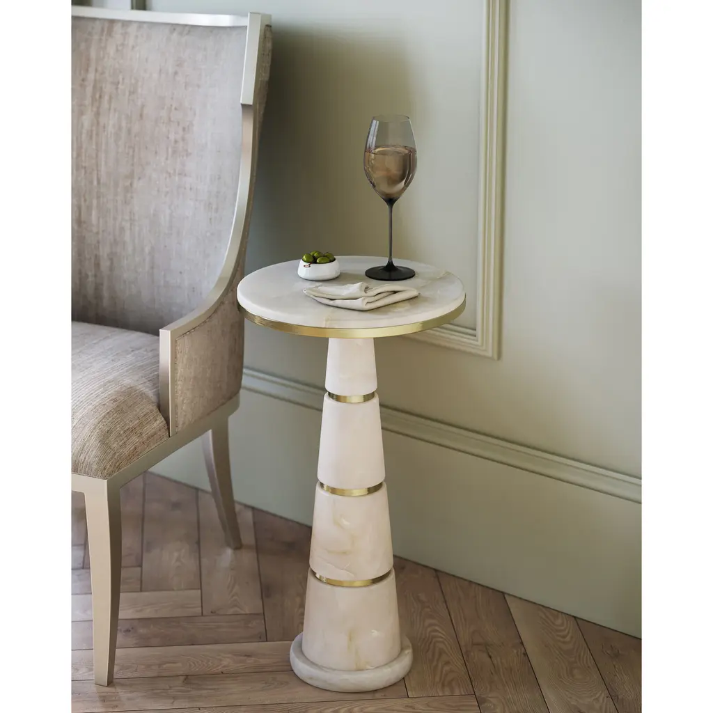 A refined balance of natural elegance and warm metallic accents, the Eleanora Drinks Table has a telescoping pedestal composed of stacked alabaster segments, each separated by rings of brass in a gleaming brass finish. A disc of alabaster forms the tabletop and the base mirrors this design, with a smaller alabaster disc anchoring the composition.