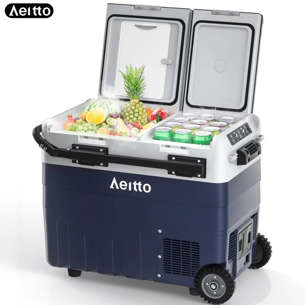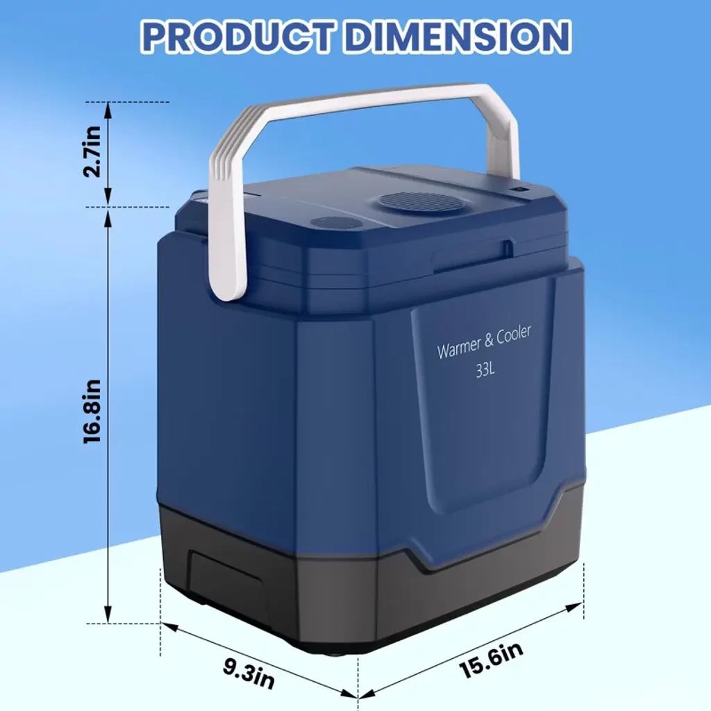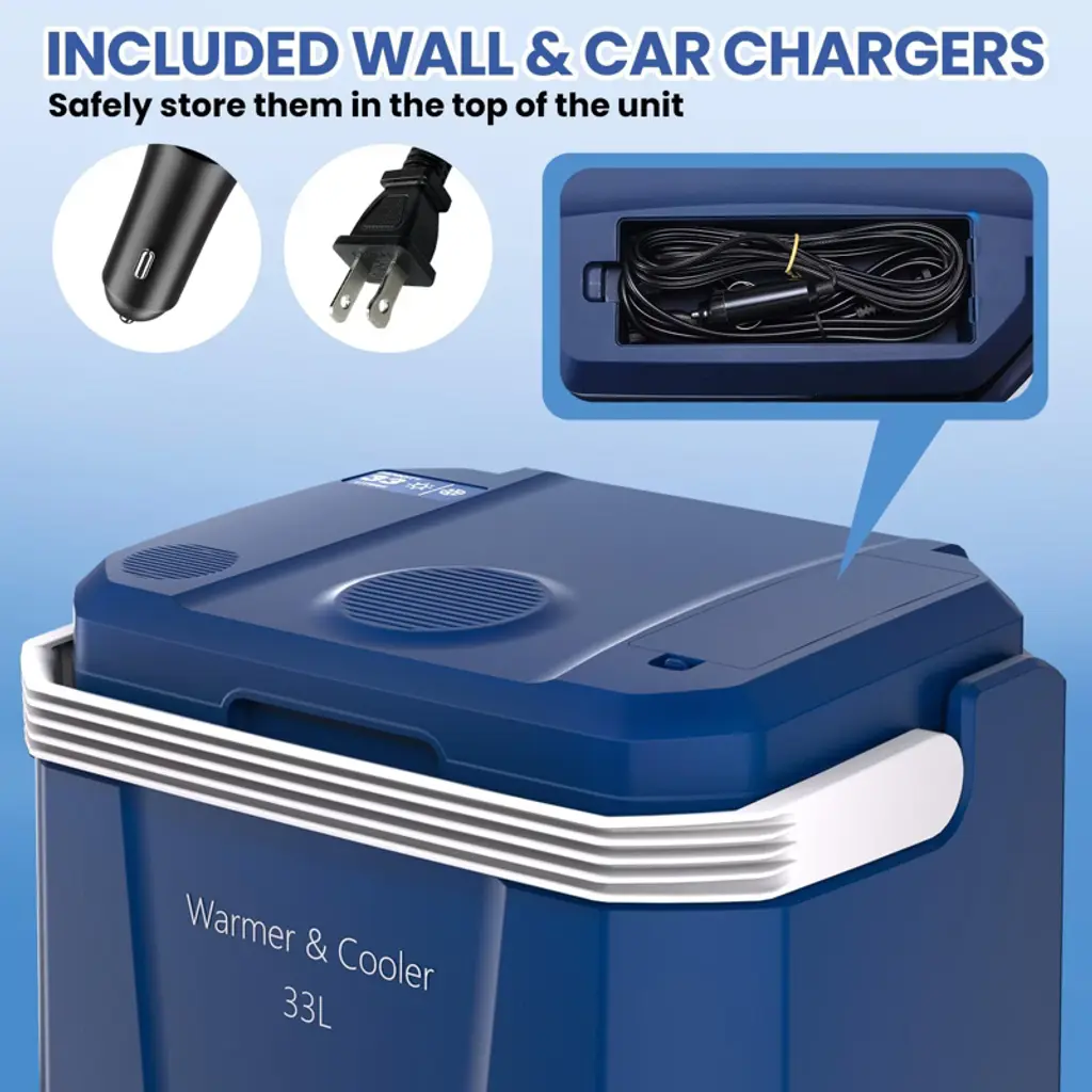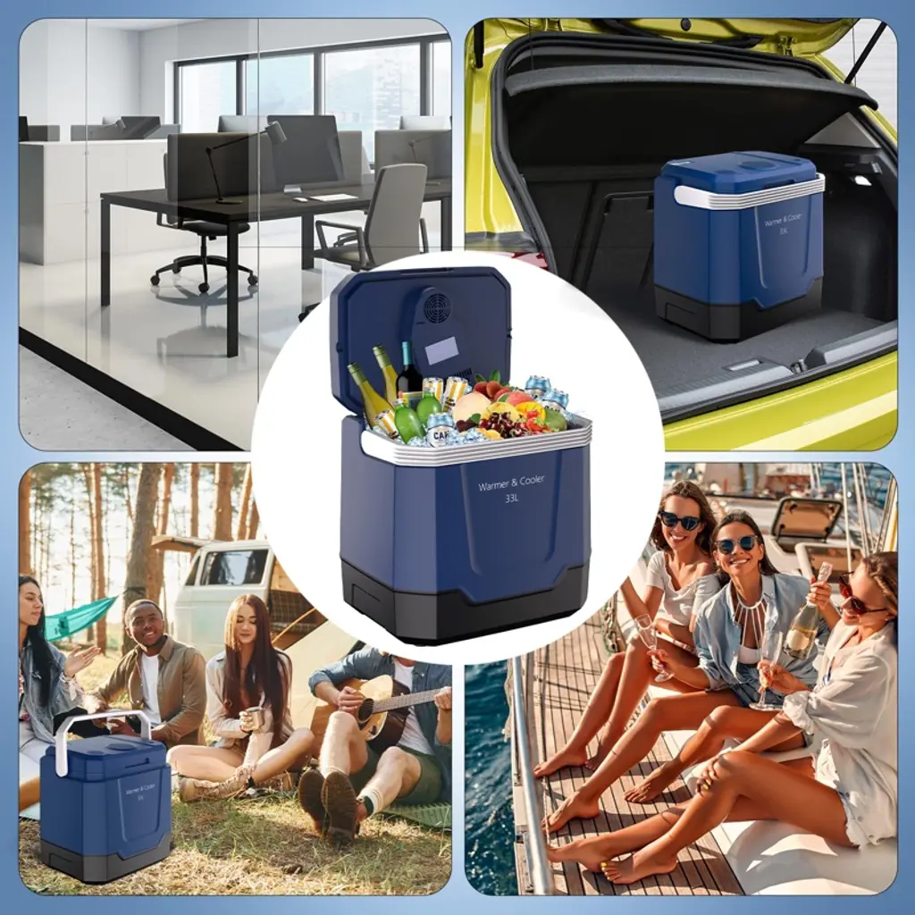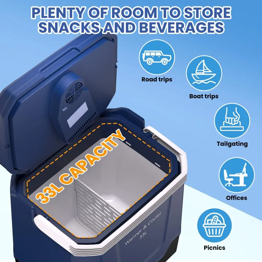 The Versatile Thermoelectric Cooler & Warmer keeps food and drinks at perfect temperatures (32°F cold/131°F hot) for any adventure. Its 33-liter capacity accommodates beverages, meals, and medications, while dual-mode switching and multi-power options make it ideal for camping, catering, and road trips. Features include auto-locking handles, LED lighting, and easy-cleaning design. Key Features: ✔ Dual Temperature Control - Maintains 32°F for cooling or 131°F for heating (thermoelectric tech) ✔ Spacious 33L Interior - Holds bottles, 2-liter sodas, meal containers & medical supplies ✔ Instant Mode Switching - One-touch button to change between cold/hot modes ✔ All-Terrain Portability - Foldable auto-lock handle with spill-proof lid security ✔ Universal Power Supply - Works on both AC outlets & DC car lighter sockets ✔ User-Friendly Design - Built-in fan, LED interior light, and wipe-clean surfaces ✔ Outdoor-Ready - Perfect for camping, picnics, catering events and road trips