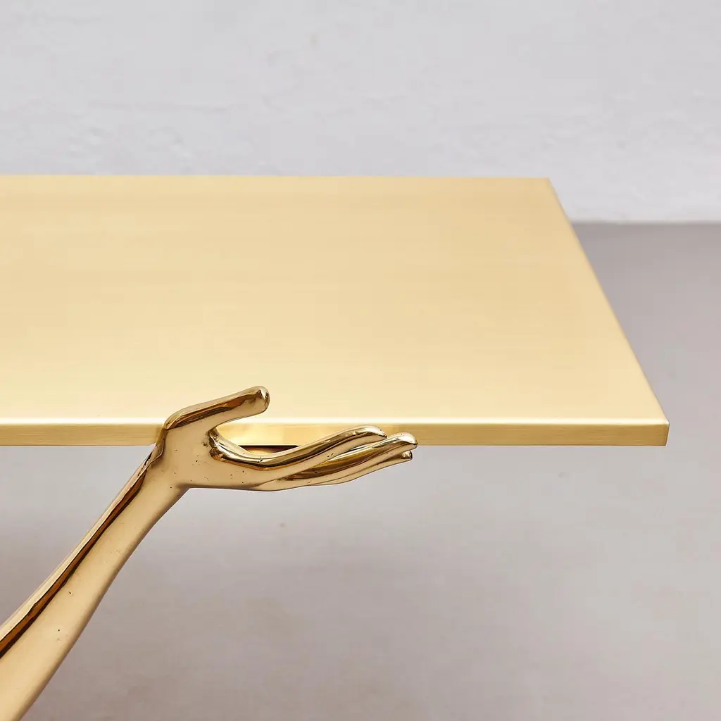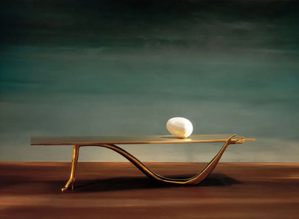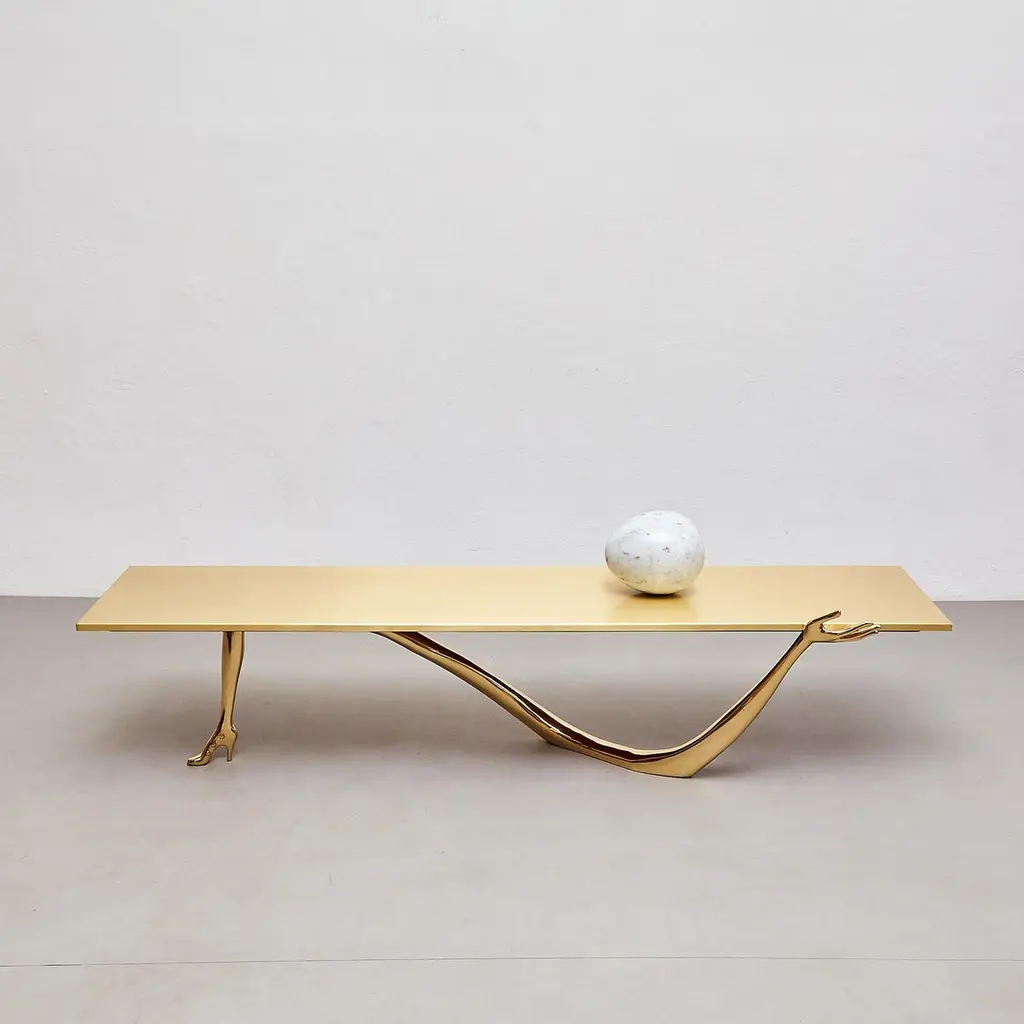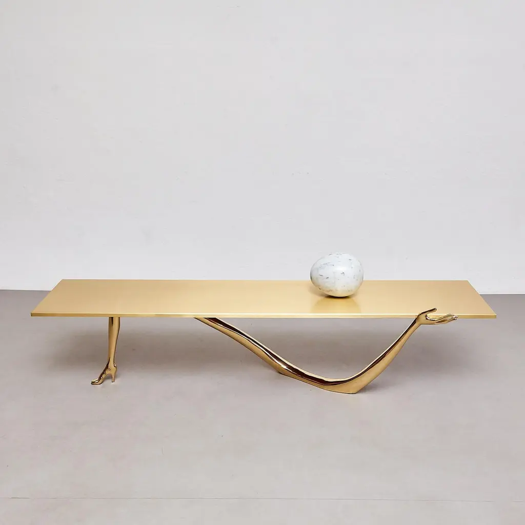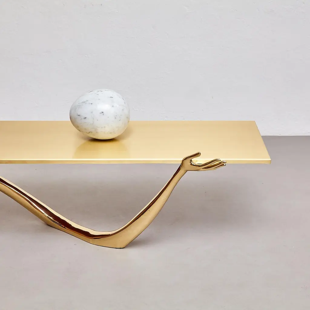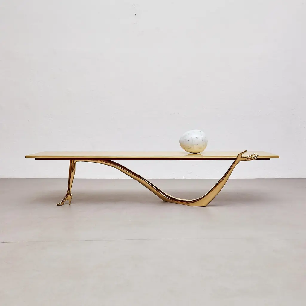 Introducing the captivating Leda Low Table, a stunning embodiment of artistry and design that seamlessly merges functionality with elegance. Crafted with unparalleled attention to detail, this exquisite piece stands as a testament to Salvador Dalí's visionary collaboration with renowned furniture maker and decorator Jean-Michel Frank during the vibrant artistic scene of 1930s Paris.The Leda Low Table is a masterpiece that exudes sophistication and refinement in every element. Supported by legs cast in a lustrous varnish brass, the table's base boasts a sense of timeless luxury. The tabletop, brushed and adorned with a varnished brass finish, radiates an enchanting allure. Crowning this masterpiece is a Carrara marble egg, a nod to Dalí's penchant for combining unexpected elements with artistic flair.Measuring an impressive 51 x 190 x 61 H.cm, the Leda Low Table commands attention with its commanding presence. Its dimensions are not merely measurements, but rather a testament to the grandeur of the design.Delve into the rich history behind this creation, where Salvador Dalí and Jean-Michel Frank's creative camaraderie brought forth a unique vision that transcended traditional boundaries. This table, inspired by the painting "Femme à la tête rose" (1935), is a realization of Dalí's multifaceted talents as a designer, extending beyond conventional furnishing elements to embrace tap fittings, handles, and even printed fabrics.Each Leda Low Table is a symphony of craftsmanship, meticulously crafted by the hands of skilled artisans. Their touch infuses every piece with a sense of individuality and artistry, ensuring that no two tables are alike. Celebrating the human element in creation, subtle variations in texture, small scratches, and nuanced differences in the brass finish emerge, bearing witness to the dedication invested in each masterpiece.These unique qualities, such as occasional stains or subtle tonal variations on the surface, weave a tale of authenticity and charm. Embracing these nuances elevates the Leda Low Table from mere furniture to a cherished sculptural masterpiece that tells the story of its creation. Mass-produced alternatives pale in comparison to the organic beauty of handcrafted pieces that exude timeless elegance and soulful character.Enrich your space with the Leda Low Table, a harmonious blend of history, art, and craftsmanship that resonates with connoisseurs of beauty and aficionados of the extraordinary.