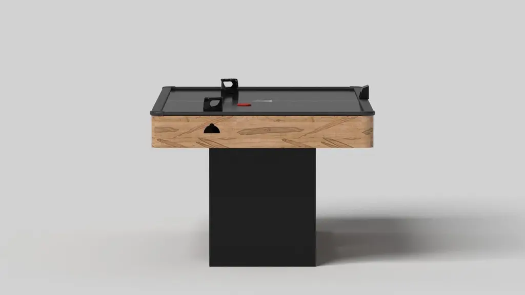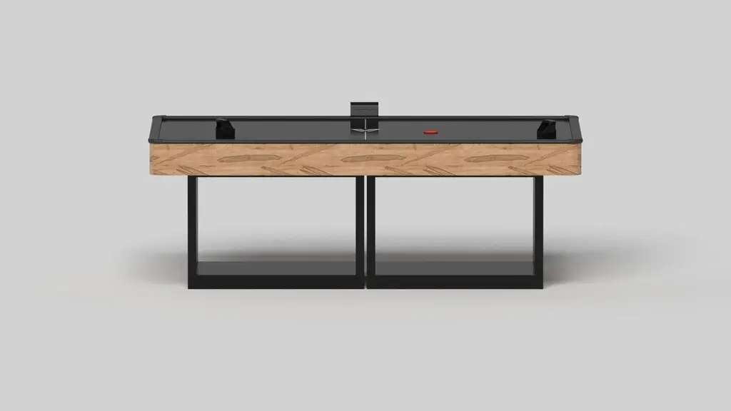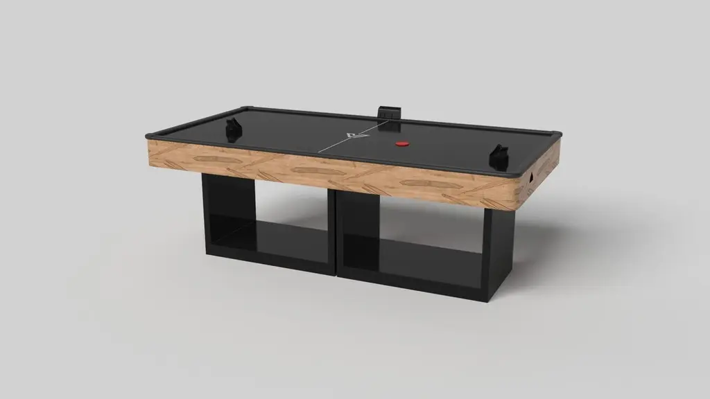 Supported by two rectangular open pedestals as the base, this handcrafted air hockey table is modern and minimalistic with its combination of simple, geometric forms. Viewed from the front, the use of negative space is evident; viewed from the side, the base appears to be one solid form. A hand-sanded hardwood top frames the impeccable game surface, allowing for the perfect combination of superior playability and irrefutable style.Size:88”X45”X31”