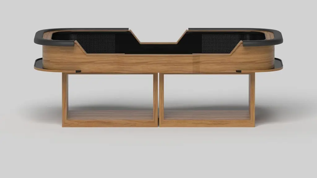 Supported by two rectangular open pedestals as the base, the Ambrosia craps table is modern and minimalistic with its combination of simple, geometric forms. Viewed from the front, the use of negative space is evident; viewed from the side, the base appears to be one solid form. A rectangular top frames the impeccable game surface, allowing for the perfect combination of superior playability and irrefutable style.Size:117”X60”X42”Custom Sizes Available Per Request