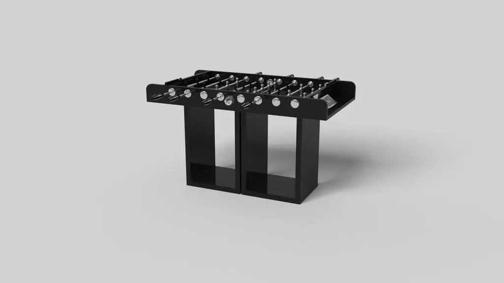 Supported by two rectangular open pedestals as the base, this handcrafted foosball table is modern and minimalistic with its combination of simple, geometric forms. Viewed from the front, the use of negative space is evident; viewed from the side, the base appears to be one solid form. A hand-sanded hardwood top frames the impeccable game surface, allowing for the perfect combination of superior playability and irrefutable style.Size:62”X31”X36”