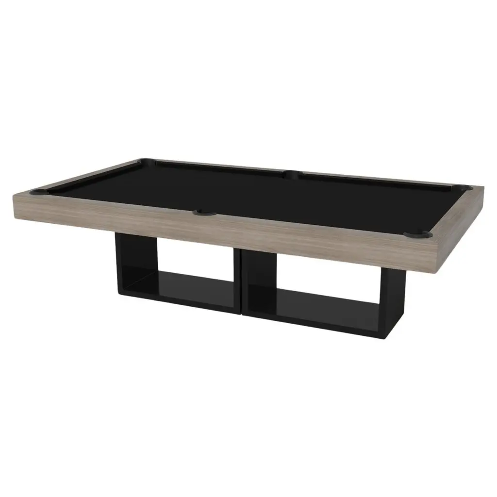 Supported by two rectangular open pedestals as the base, this handcrafted pool table is modern and minimalistic with its combination of simple, geometric forms. Viewed from the front, the use of negative space is evident; viewed from the side, the base appears to be one solid form. A hand-sanded hardwood top frames the impeccable game surface, allowing for the perfect combination of superior playability and irrefutable style.Size:8.5 Foot – 108”X60”Playing Area: 92”X46”