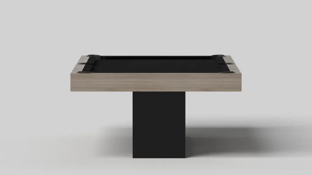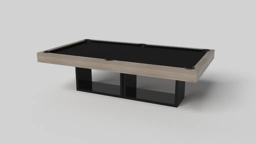 Supported by two rectangular open pedestals as the base, this handcrafted pool table is modern and minimalistic with its combination of simple, geometric forms. Viewed from the front, the use of negative space is evident; viewed from the side, the base appears to be one solid form. A hand-sanded hardwood top frames the impeccable game surface, allowing for the perfect combination of superior playability and irrefutable style.Size:9 Foot – 113”X63”Playing Area: 100”X50”