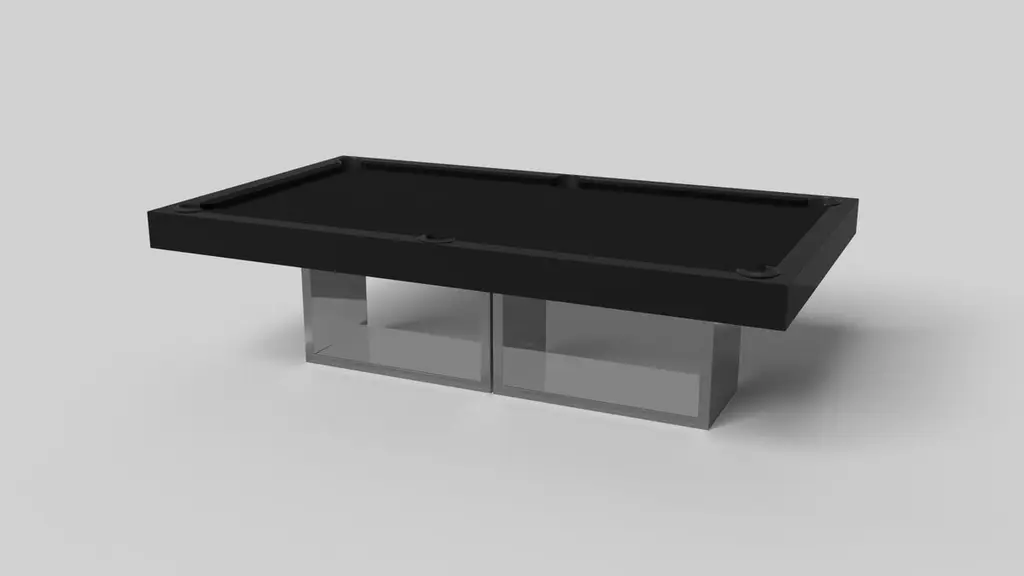 Supported by two rectangular open pedestals as the base, this handcrafted pool table is modern and minimalistic with its combination of simple, geometric forms. Viewed from the front, the use of negative space is evident; viewed from the side, the base appears to be one solid form. A hand-sanded hardwood top frames the impeccable game surface, allowing for the perfect combination of superior playability and irrefutable style.Size:7 Foot - 91”X52”Playing Area Of 39”X78”8 Foot – 101”X57”Playing Area Of 88”X44”
