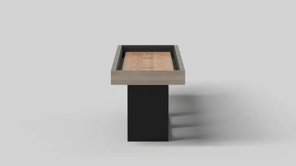 Supported by two rectangular open pedestals as the base, this handcrafted shuffleboard table is modern and minimalistic with its combination of simple, geometric forms. Viewed from the front, the use of negative space is evident; viewed from the side, the base appears to be one solid form. A hand-sanded hardwood top frames the impeccable game surface, allowing for the perfect combination of superior playability and irrefutable style.Size:18 Foot - 216”X32”X34”Playing Area Of 200”X20”