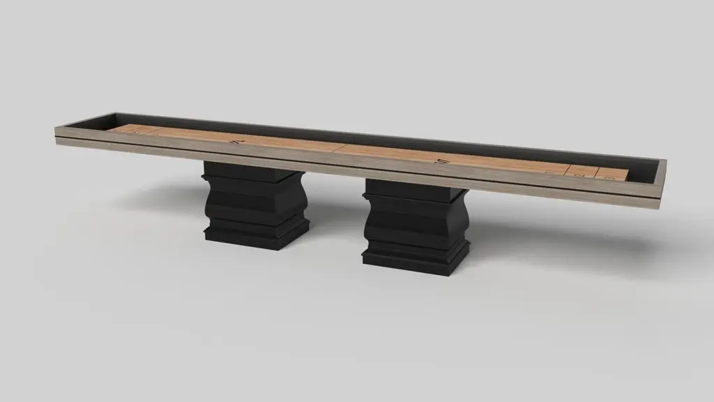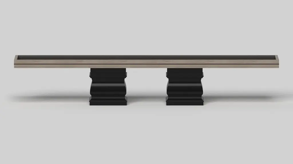 Two hand-sculpted legs bestow a sense of classic style upon this handcrafted shuffleboard table in white. This luxury wood game table features a smooth rectangular top perched upon two wide baluster column legs that mimic the curves and lines of crown molding. It’s a sophisticated option designed for superior playability – and it’s an easy addition to any room decorated with classic, traditional, or transitional decor. This table can be customized in your choice of bespoke sizes, colors, and finishes.Size:16 Foot - 192”X32”X34”Playing Area Of 176”X20”