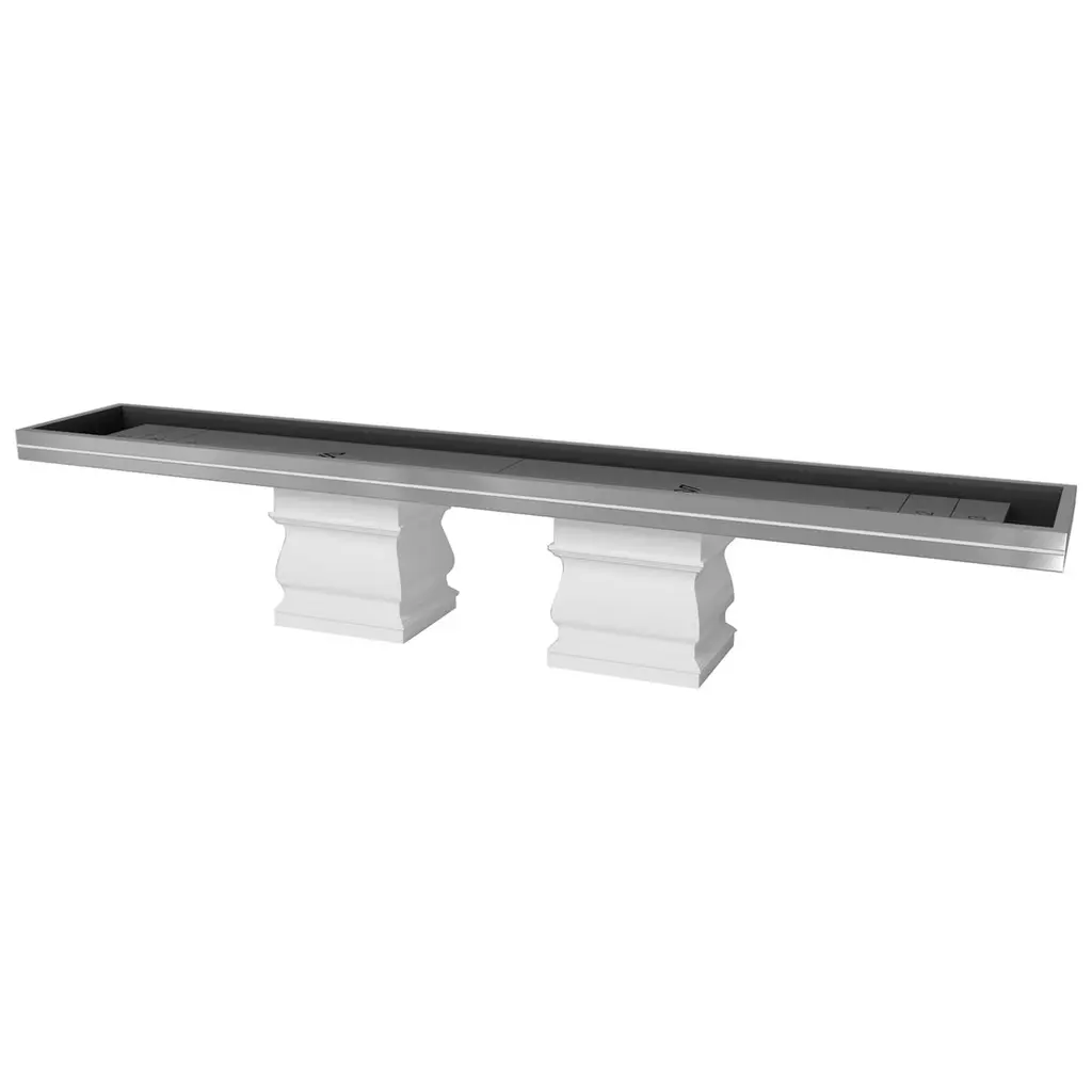 Two hand-sculpted legs bestow a sense of classic style upon this handcrafted shuffleboard table in white. This luxury wood game table features a smooth rectangular top perched upon two wide baluster column legs that mimic the curves and lines of crown molding. It’s a sophisticated option designed for superior playability – and it’s an easy addition to any room decorated with classic, traditional, or transitional decor. This table can be customized in your choice of bespoke sizes, colors, and finishes.Size:12 Foot - 144”X32”X34”Playing Area Of 128”X20”