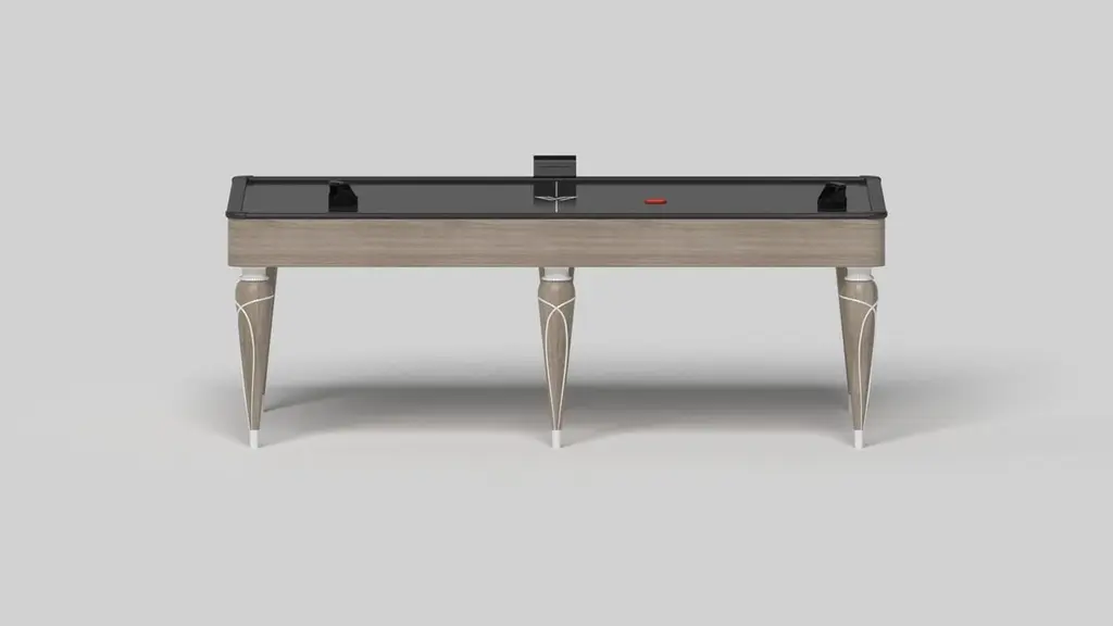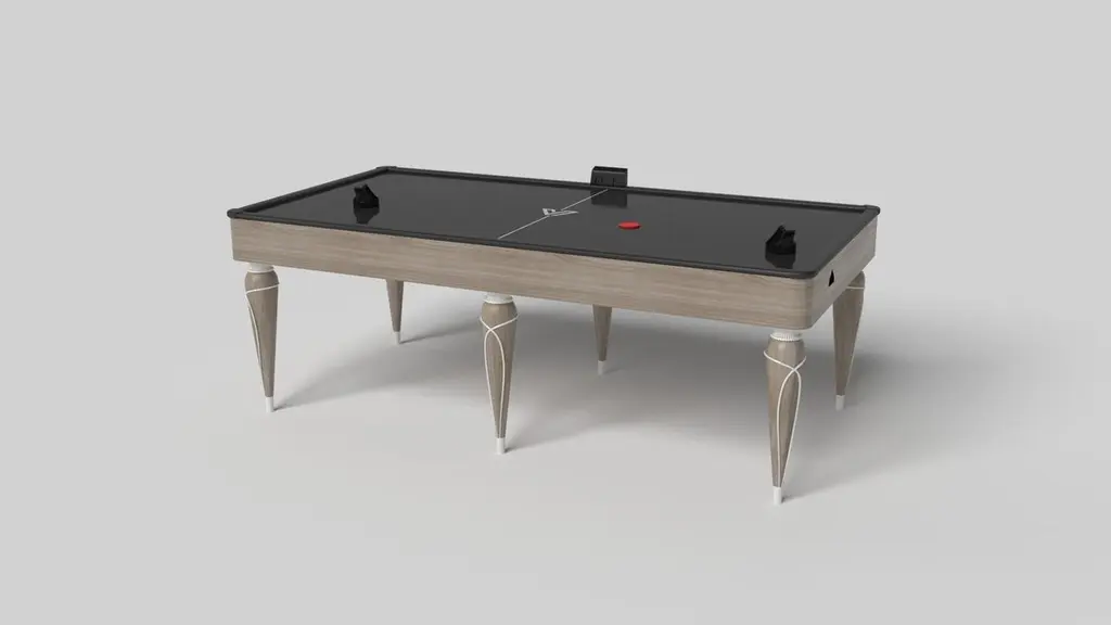 Champagne gold accents add undeniable elegance to this luxury air hockey table. Offering superior playability and uncompromised style, this design features hand carved details, decorative metal elements, and metal sabots at the bottom of each leg. The side skirts are artfully trimmed to create the high and low texture of crown molding, providing a beautiful contrast against the smooth, tapered legs. With its distinctive combination of form and function, this air hockey table is a noteworthy addition to any room.Size:88”X45”X31”