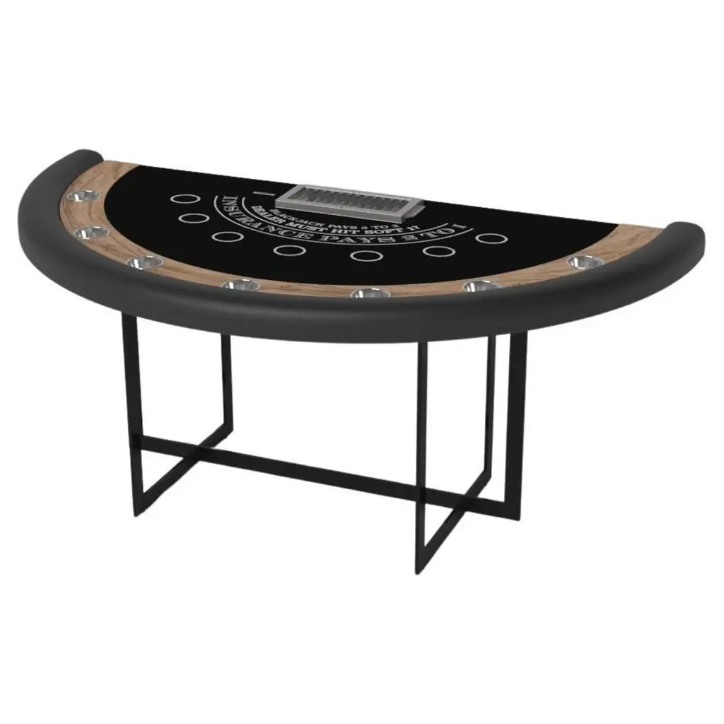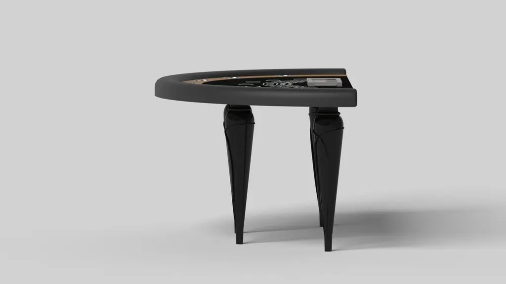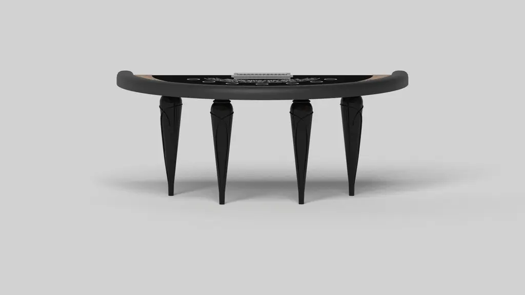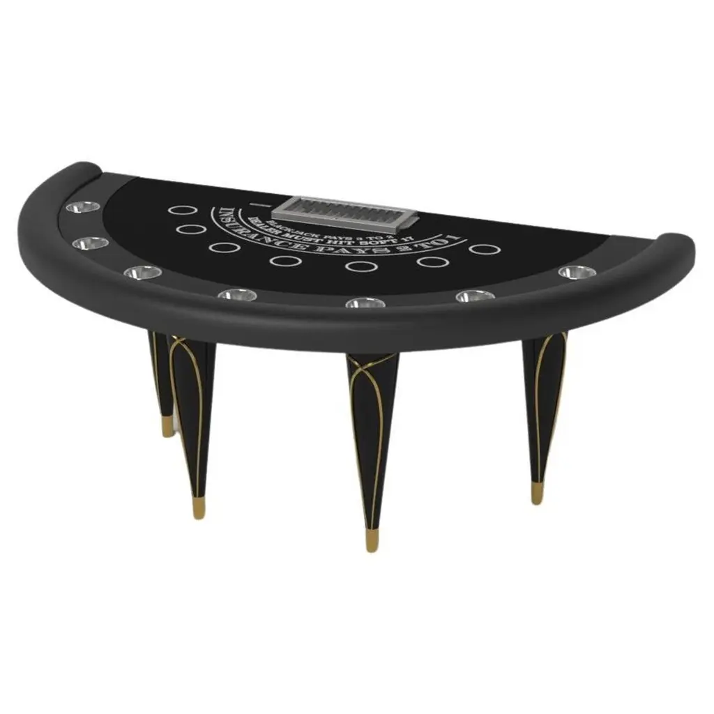 Champagne gold accents add undeniable elegance to this luxury blackjack table. Offering superior playability and uncompromised style, this design features hand carved details, decorative metal elements, and metal sabots at the bottom of each leg. The side skirts are artfully trimmed to create the high and low texture of crown molding, providing a beautiful contrast against the smooth, tapered legs. With its distinctive combination of form and function, this blackjack table is a noteworthy addition to any room.Size:88”X46”X30” (Bar Height)Custom Sizes Available Per Request