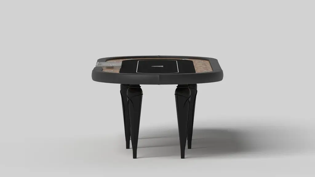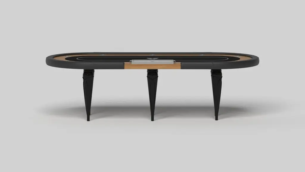 Champagne gold accents add undeniable elegance to this luxury poker table. Offering superior playability and uncompromised style, this design features hand carved details, decorative metal elements, and metal sabots at the bottom of each leg. The side skirts are artfully trimmed to create the high and low texture of crown molding, providing a beautiful contrast against the smooth, tapered legs. With its distinctive combination of form and function, this poker table is a noteworthy addition to any room.Size:104”X44”X30”Custom Sizes Available Per RequestCustom Table-Top Shapes Available Per Request