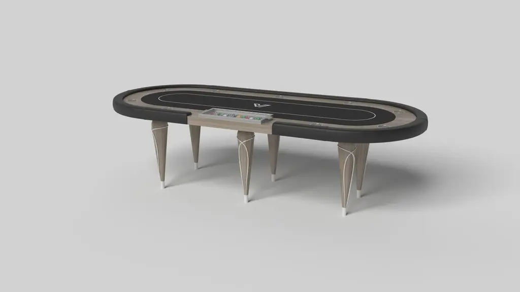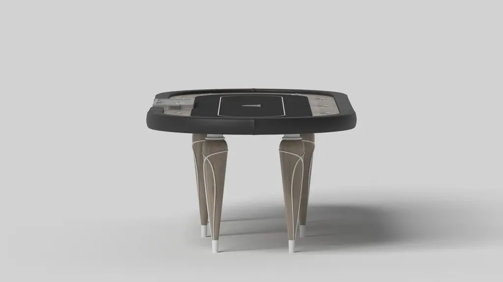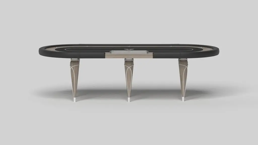 Champagne gold accents add undeniable elegance to this luxury poker table. Offering superior playability and uncompromised style, this design features hand carved details, decorative metal elements, and metal sabots at the bottom of each leg. The side skirts are artfully trimmed to create the high and low texture of crown molding, providing a beautiful contrast against the smooth, tapered legs. With its distinctive combination of form and function, this poker table is a noteworthy addition to any room.Size:104”X44”X30”Custom Sizes Available Per RequestCustom Table-Top Shapes Available Per Request