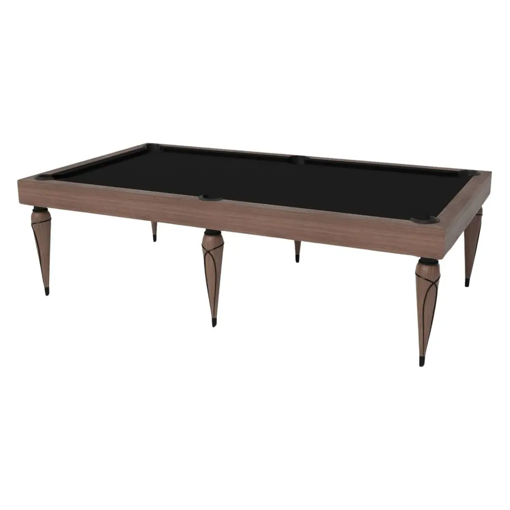 Champagne gold accents add undeniable elegance to this luxury pool table. Offering superior playability and uncompromised style, this design features hand carved details, decorative metal elements, and metal sabots at the bottom of each leg. The side skirts are artfully trimmed to create the high and low texture of crown molding, providing a beautiful contrast against the smooth, tapered legs. With its distinctive combination of form and function, this pool table is a noteworthy addition to any room.Size:9 Foot – 113”X63”Playing Area: 100”X50”