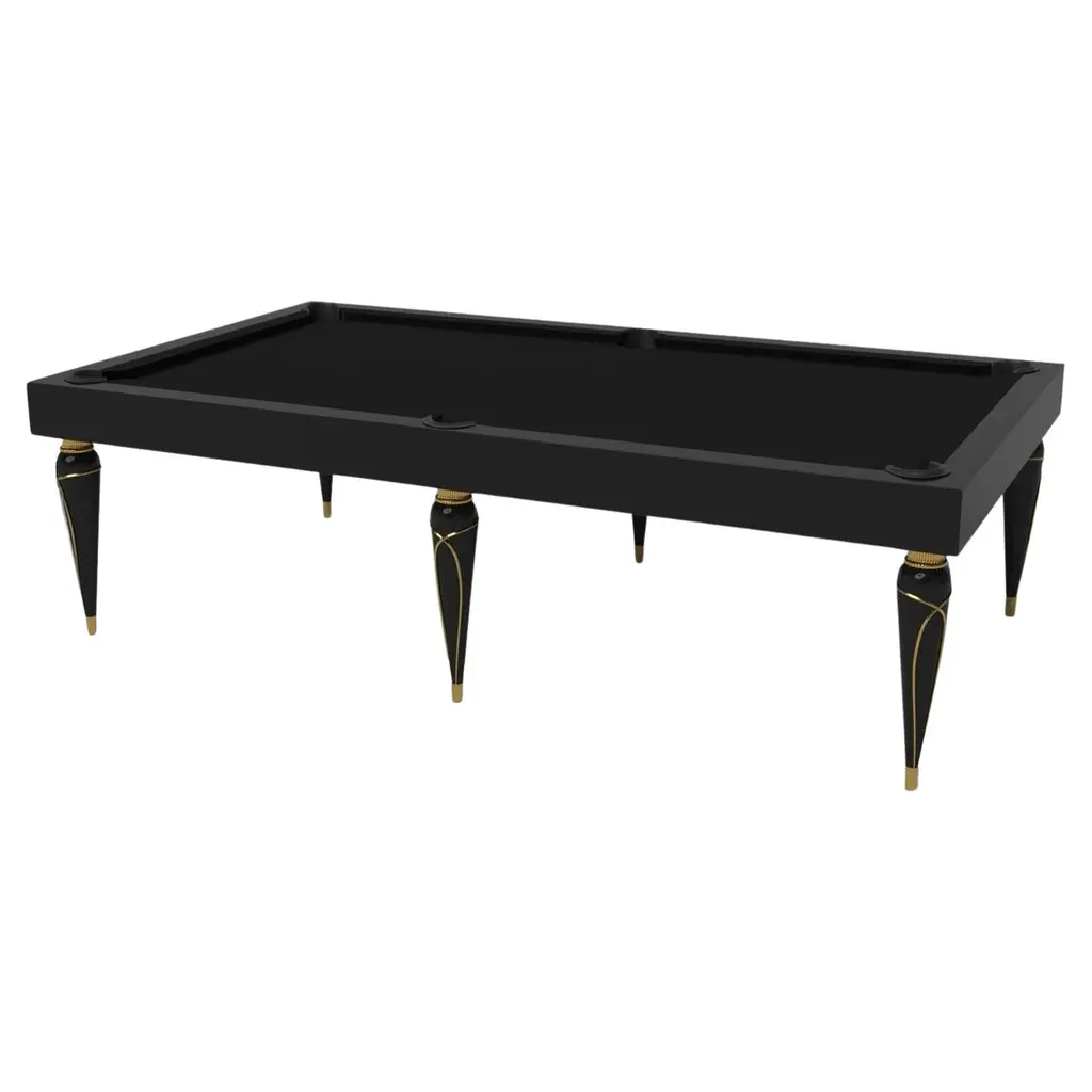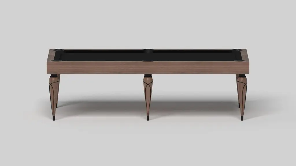 Champagne gold accents add undeniable elegance to this luxury pool table. Offering superior playability and uncompromised style, this design features hand carved details, decorative metal elements, and metal sabots at the bottom of each leg. The side skirts are artfully trimmed to create the high and low texture of crown molding, providing a beautiful contrast against the smooth, tapered legs. With its distinctive combination of form and function, this pool table is a noteworthy addition to any room.Size:9 Foot – 113”X63”Playing Area: 100”X50”