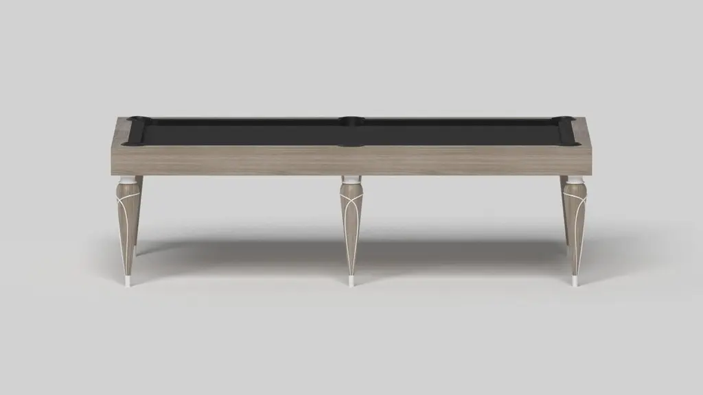 Champagne gold accents add undeniable elegance to this luxury pool table. Offering superior playability and uncompromised style, this design features hand carved details, decorative metal elements, and metal sabots at the bottom of each leg. The side skirts are artfully trimmed to create the high and low texture of crown molding, providing a beautiful contrast against the smooth, tapered legs. With its distinctive combination of form and function, this pool table is a noteworthy addition to any room.Size:9 Foot – 113”X63”Playing Area: 100”X50”