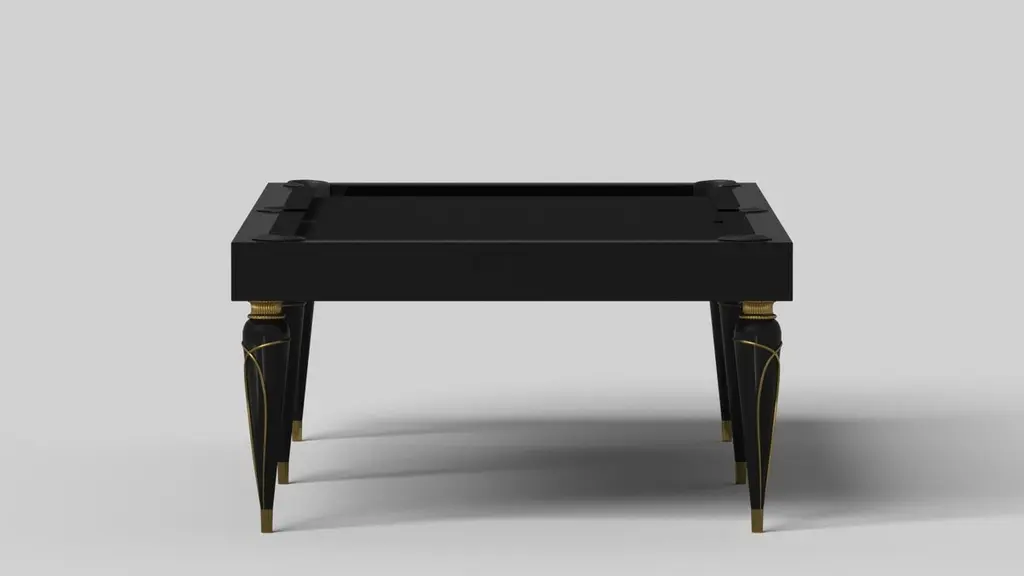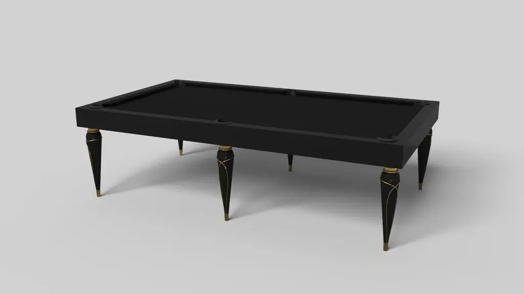 Champagne gold accents add undeniable elegance to this luxury pool table. Offering superior playability and uncompromised style, this design features hand carved details, decorative metal elements, and metal sabots at the bottom of each leg. The side skirts are artfully trimmed to create the high and low texture of crown molding, providing a beautiful contrast against the smooth, tapered legs. With its distinctive combination of form and function, this pool table is a noteworthy addition to any room.Size:9 Foot – 113”X63”Playing Area: 100”X50”
