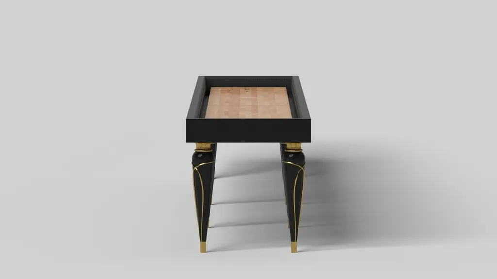 Champagne gold accents add undeniable elegance to this luxury shuffleboard table. Offering superior playability and uncompromised style, this design features hand carved details, decorative metal elements, and metal sabots at the bottom of each leg. The side skirts are artfully trimmed to create the high and low texture of crown molding, providing a beautiful contrast against the smooth, tapered legs. With its distinctive combination of form and function, this shuffleboard table is a noteworthy addition to any room.Size:9 Foot - 108”X32”X34”Playing Area Of 92”X20”