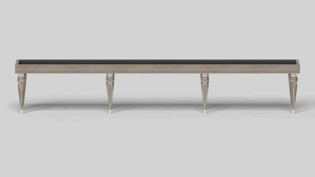 Champagne gold accents add undeniable elegance to this luxury shuffleboard table. Offering superior playability and uncompromised style, this design features hand carved details, decorative metal elements, and metal sabots at the bottom of each leg. The side skirts are artfully trimmed to create the high and low texture of crown molding, providing a beautiful contrast against the smooth, tapered legs. With its distinctive combination of form and function, this shuffleboard table is a noteworthy addition to any room.Size:12 Foot - 144”X32”X34”Playing Area Of 128”X20”