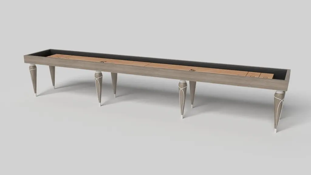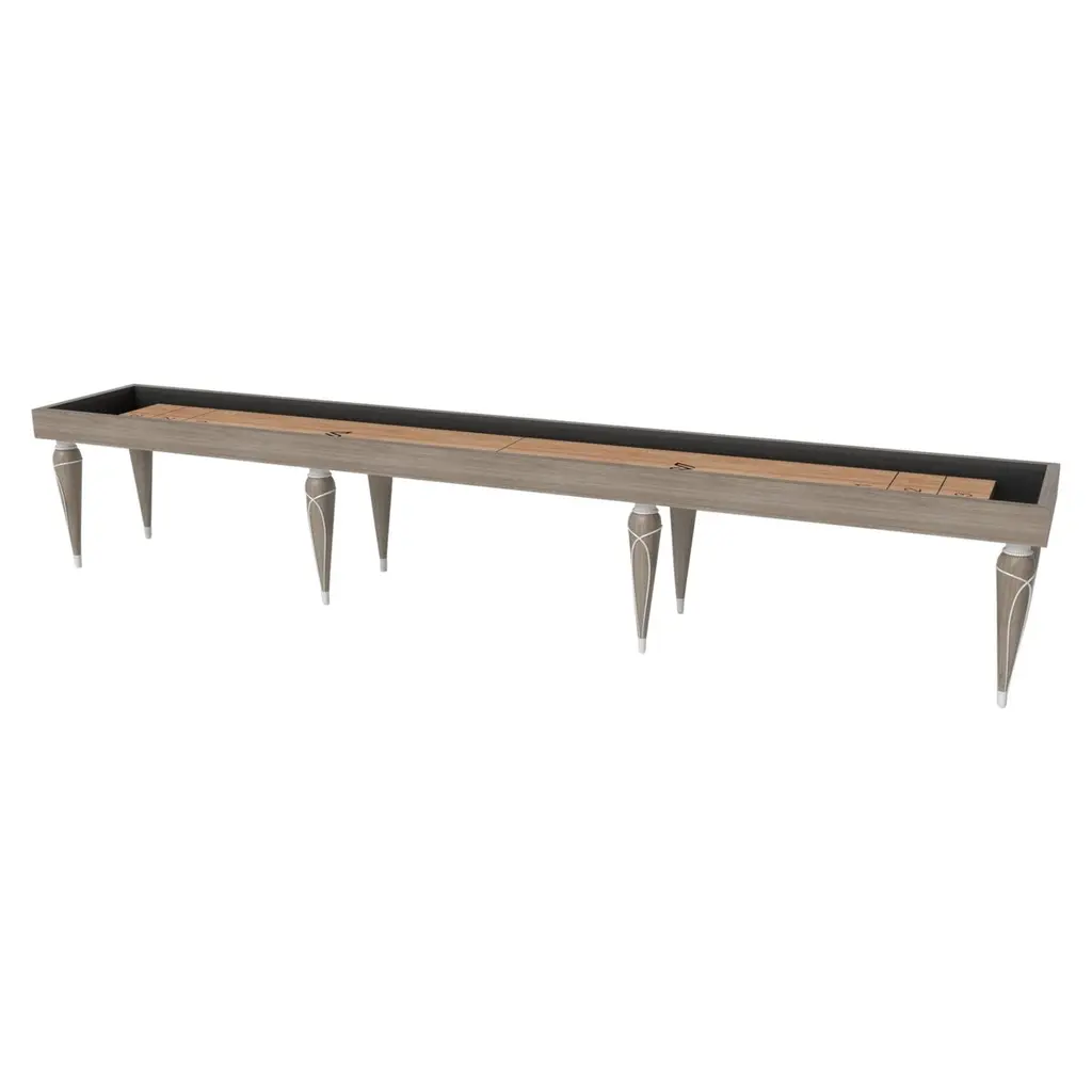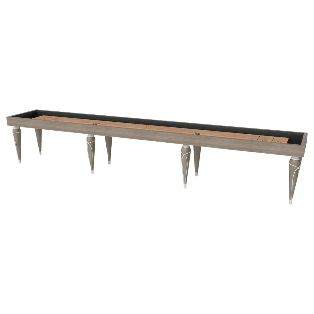 Champagne gold accents add undeniable elegance to this luxury shuffleboard table. Offering superior playability and uncompromised style, this design features hand carved details, decorative metal elements, and metal sabots at the bottom of each leg. The side skirts are artfully trimmed to create the high and low texture of crown molding, providing a beautiful contrast against the smooth, tapered legs. With its distinctive combination of form and function, this shuffleboard table is a noteworthy addition to any room.Size:9 Foot - 108”X32”X34”Playing Area Of 92”X20”