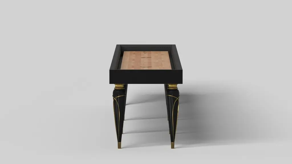 Champagne gold accents add undeniable elegance to this luxury shuffleboard table. Offering superior playability and uncompromised style, this design features hand carved details, decorative metal elements, and metal sabots at the bottom of each leg. The side skirts are artfully trimmed to create the high and low texture of crown molding, providing a beautiful contrast against the smooth, tapered legs. With its distinctive combination of form and function, this shuffleboard table is a noteworthy addition to any room.Size:12 Foot - 144”X32”X34”Playing Area Of 128”X20”