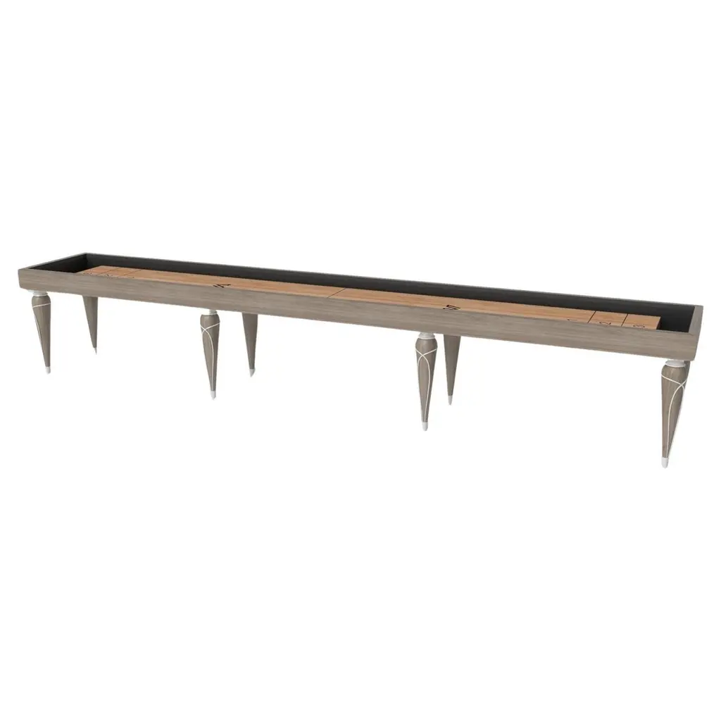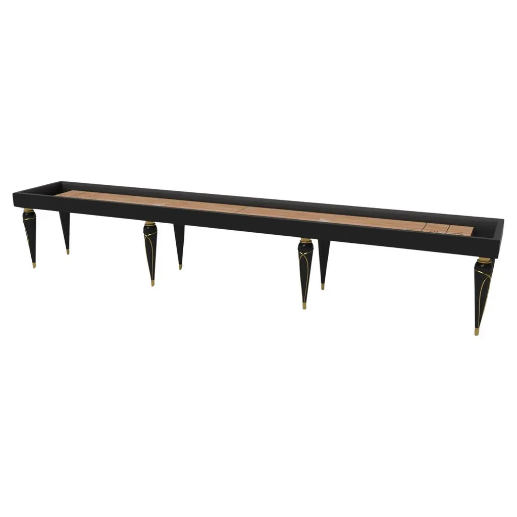 Champagne gold accents add undeniable elegance to this luxury shuffleboard table. Offering superior playability and uncompromised style, this design features hand carved details, decorative metal elements, and metal sabots at the bottom of each leg. The side skirts are artfully trimmed to create the high and low texture of crown molding, providing a beautiful contrast against the smooth, tapered legs. With its distinctive combination of form and function, this shuffleboard table is a noteworthy addition to any room.Size:22 Foot - 264”X32”X34”Playing Area Of 248”X20”