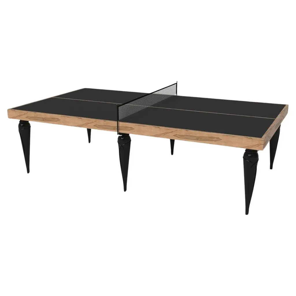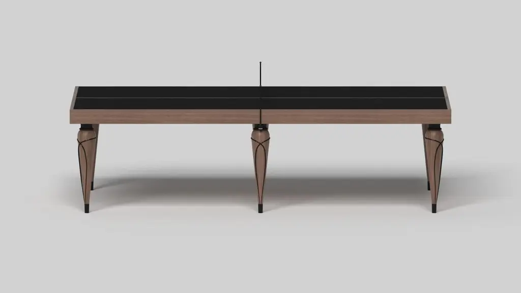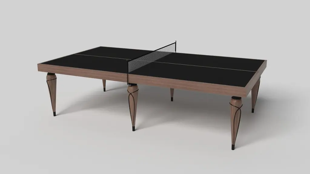Champagne gold accents add undeniable elegance to this luxury table tennis table. Offering superior playability and uncompromised style, this design features hand carved details, decorative metal elements, and metal sabots at the bottom of each leg. The side skirts are artfully trimmed to create the high and low texture of crown molding, providing a beautiful contrast against the smooth, tapered legs. With its distinctive combination of form and function, this table tennis table is a noteworthy addition to any room.Size:108”X60”X30”Custom Sizes Available Per Request