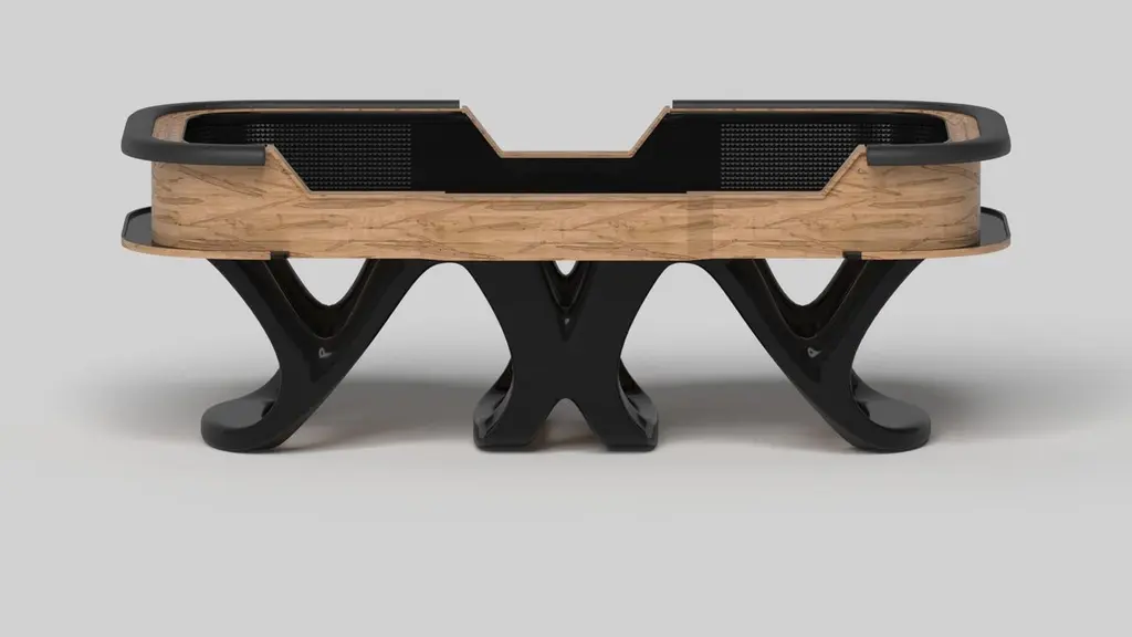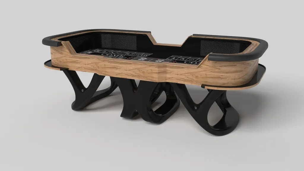 Inspired by the work of Antoni Gaudi and the movement of Catalan Modernism, the Draco craps table in walnut boasts bold style with smooth, curved legs and a clean top with point boxes and bet blocks for professional game play. Expertly crafted from top to bottom, this table features a high-end, contemporary design in a smooth walnut finish.Size:117”X60”X42”Custom Sizes Available Per Request