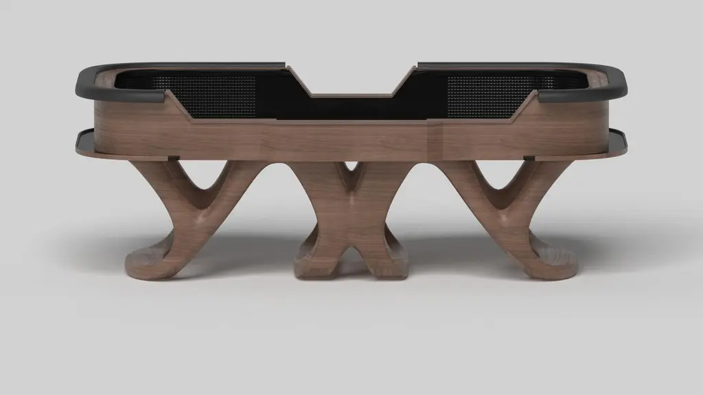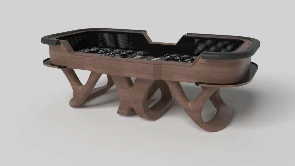 Inspired by the work of Antoni Gaudi and the movement of Catalan Modernism, the Draco craps table in walnut boasts bold style with smooth, curved legs and a clean top with point boxes and bet blocks for professional game play. Expertly crafted from top to bottom, this table features a high-end, contemporary design in a smooth walnut finish.Size:117”X60”X42”Custom Sizes Available Per Request