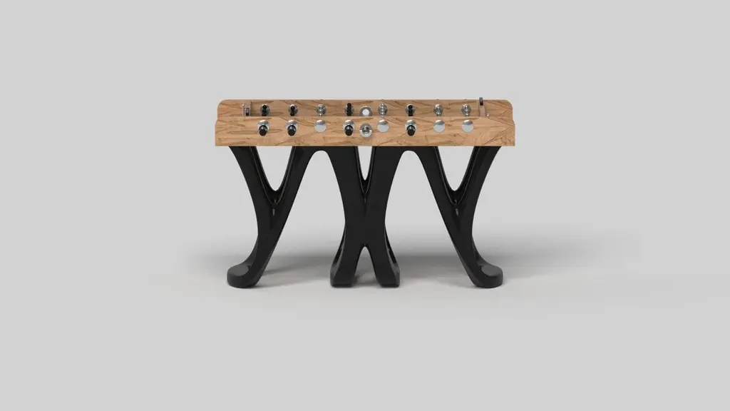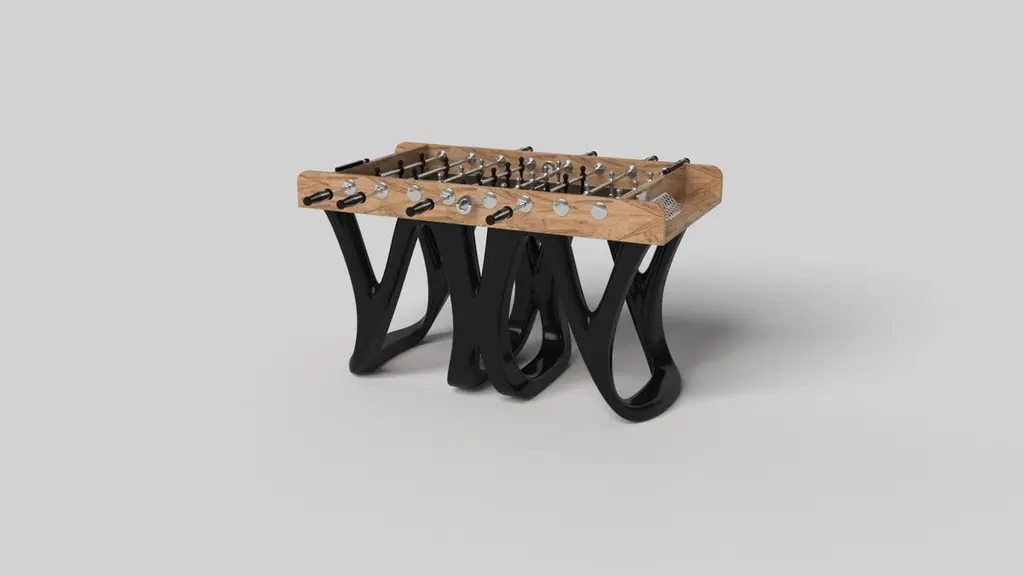 Inspired by the work of Antoni Gaudi and the movement of Catalan Modernism, the Draco foosball table in walnut boasts bold style with smooth, curved legs and a detailed surface for professional game play. Expertly crafted from solid wood, this table features a high-end, contemporary design in a neutral wood finish.Size:62”X31”X36”