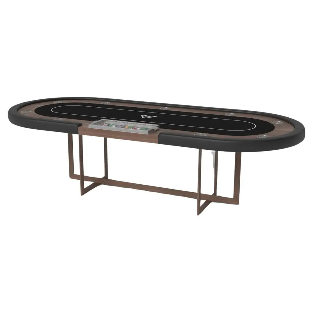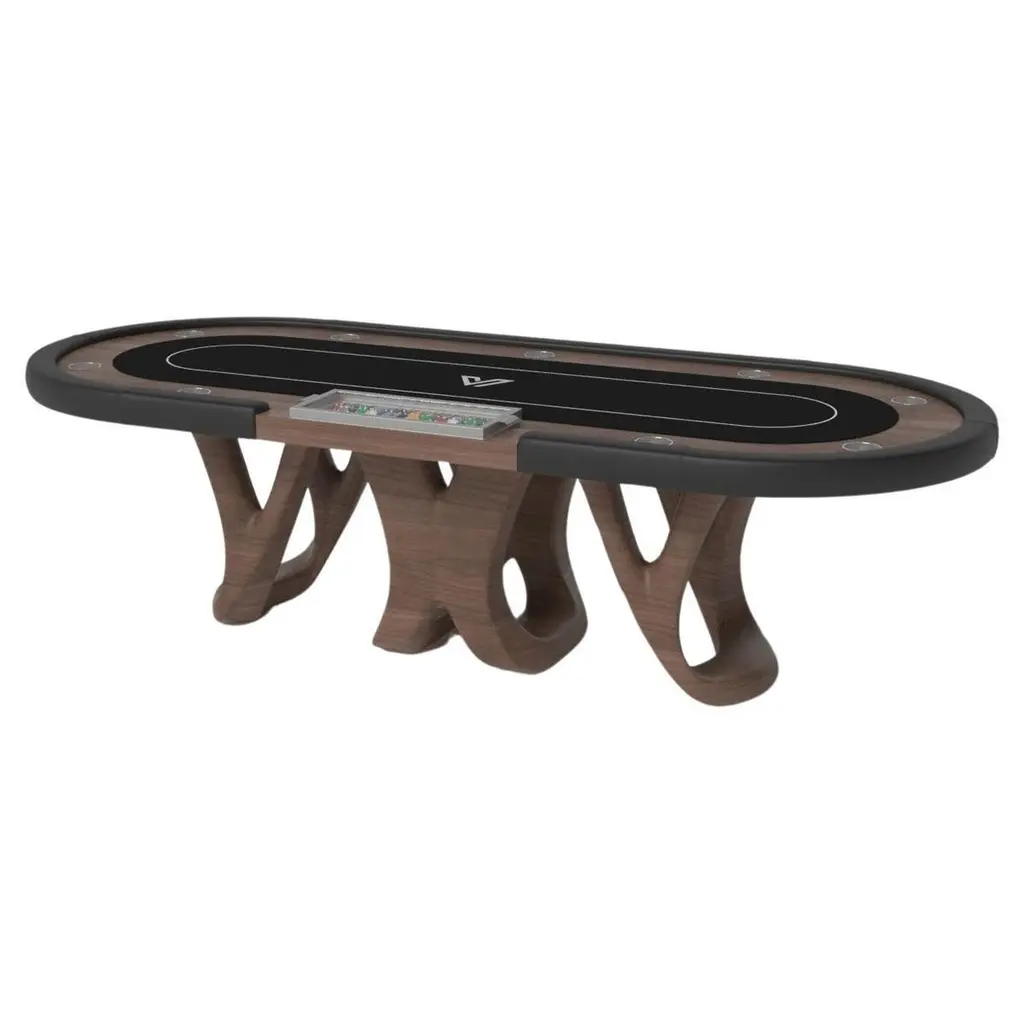 Inspired by the work of Antoni Gaudi and the movement of Catalan Modernism, the Draco poker table in walnut boasts bold style with smooth, curved legs and a detailed surface for professional game play. Expertly crafted from solid wood, this table features a high-end, contemporary design in a versatile wood finish.Size:104”X44”X30”Custom Sizes Available Per RequestCustom Table-Top Shapes Available Per Request