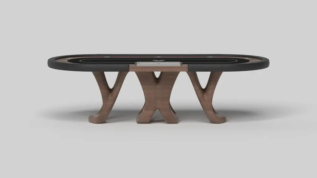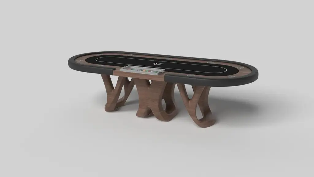 Inspired by the work of Antoni Gaudi and the movement of Catalan Modernism, the Draco poker table in walnut boasts bold style with smooth, curved legs and a detailed surface for professional game play. Expertly crafted from solid wood, this table features a high-end, contemporary design in a versatile wood finish.Size:104”X44”X30”Custom Sizes Available Per RequestCustom Table-Top Shapes Available Per Request