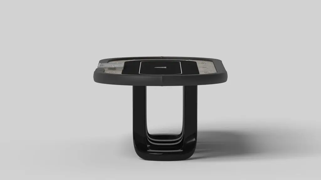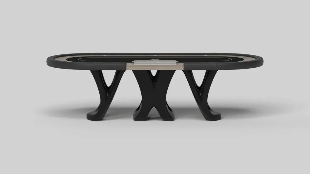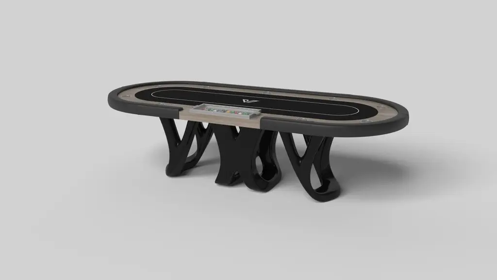 Inspired by the work of Antoni Gaudi and the movement of Catalan Modernism, the Draco poker table in walnut boasts bold style with smooth, curved legs and a detailed surface for professional game play. Expertly crafted from solid wood, this table features a high-end, contemporary design in a versatile wood finish.Size:104”X44”X30”Custom Sizes Available Per RequestCustom Table-Top Shapes Available Per Request