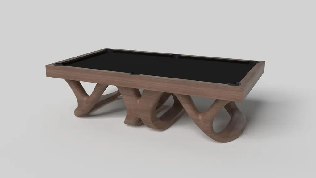 Inspired by the work of Antoni Gaudi and the movement of Catalan Modernism, the Draco pool table in walnut boasts bold style with smooth, curved legs and a rich felt surface for professional game play. Expertly crafted from solid wood, this table features a high-end, contemporary design in a versatile walnut finishSize:9 Foot – 113”X63”Playing Area: 100”X50”