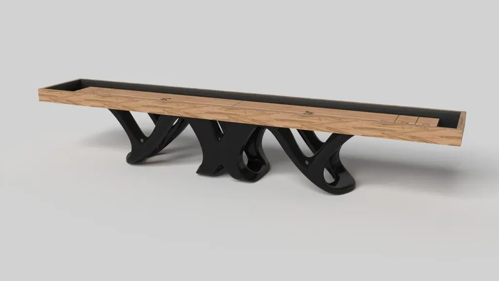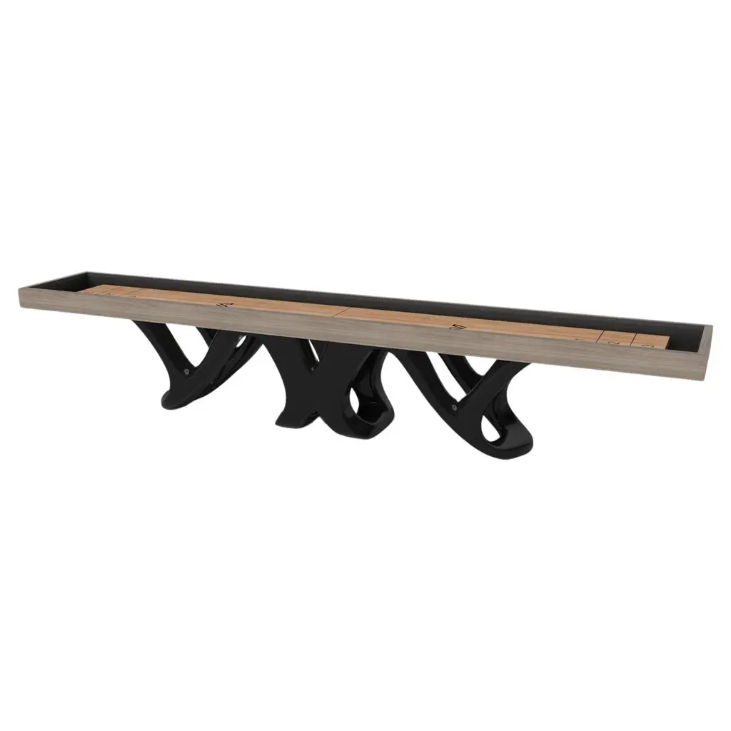 Inspired by the work of Antoni Gaudi and the movement of Catalan Modernism, the Draco shuffleboard table in Walnut boasts bold style with smooth, curved legs and a rich smooth professional grade Maple wood surface surface for professional game play. Expertly crafted from Walnut wood, this table features a high-end, contemporary design in a black finish with stark white accents.Size:16 Foot - 192”X32”X34”Playing Area Of 176”X20”