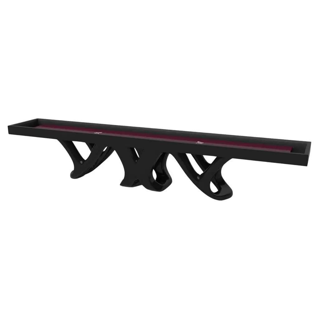 Inspired by the work of Antoni Gaudi and the movement of Catalan Modernism, the Draco shuffleboard table in Walnut boasts bold style with smooth, curved legs and a rich smooth professional grade Maple wood surface surface for professional game play. Expertly crafted from Walnut wood, this table features a high-end, contemporary design in a black finish with stark white accents.Size:12 Foot - 144”X32”X34”Playing Area Of 128”X20”