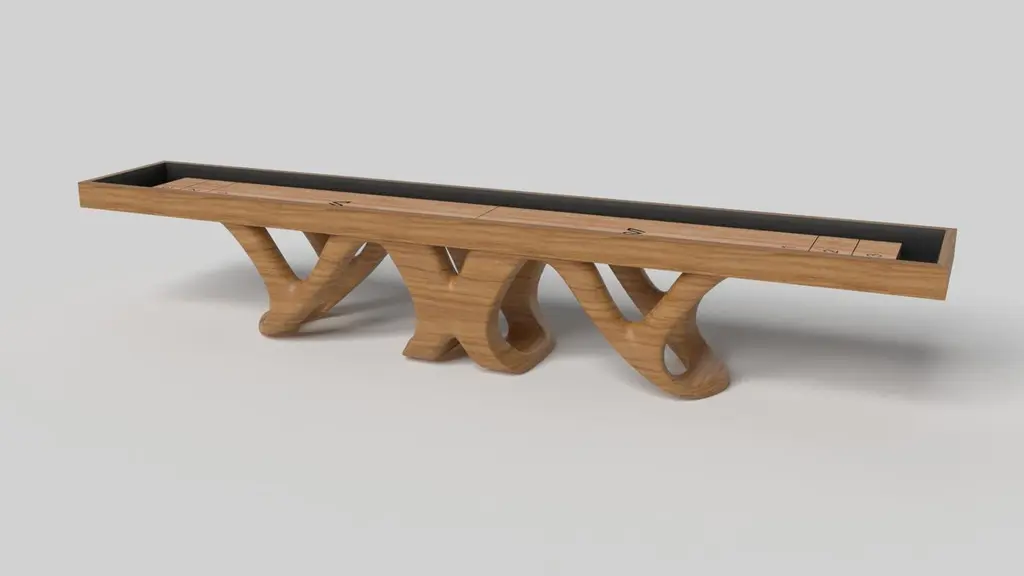 Inspired by the work of Antoni Gaudi and the movement of Catalan Modernism, the Draco shuffleboard table in Walnut boasts bold style with smooth, curved legs and a rich smooth professional grade Maple wood surface surface for professional game play. Expertly crafted from Walnut wood, this table features a high-end, contemporary design in a black finish with stark white accents.Size:12 Foot - 144”X32”X34”Playing Area Of 128”X20”