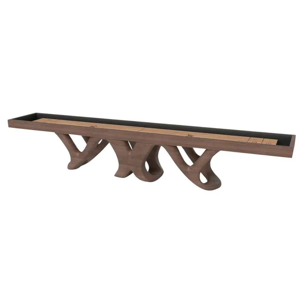 Inspired by the work of Antoni Gaudi and the movement of Catalan Modernism, the Draco shuffleboard table in Walnut boasts bold style with smooth, curved legs and a rich smooth professional grade Maple wood surface surface for professional game play. Expertly crafted from Walnut wood, this table features a high-end, contemporary design in a black finish with stark white accents.Size:18 Foot - 216”X32”X34”Playing Area Of 200”X20”