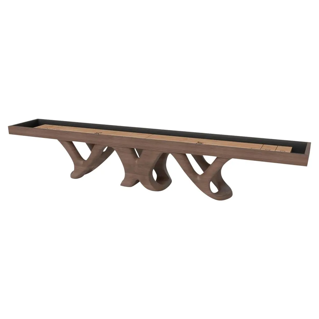 Inspired by the work of Antoni Gaudi and the movement of Catalan Modernism, the Draco shuffleboard table in Walnut boasts bold style with smooth, curved legs and a rich smooth professional grade Maple wood surface surface for professional game play. Expertly crafted from Walnut wood, this table features a high-end, contemporary design in a black finish with stark white accents.Size:9 Foot - 108”X32”X34”Playing Area Of 92”X20”