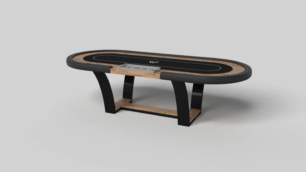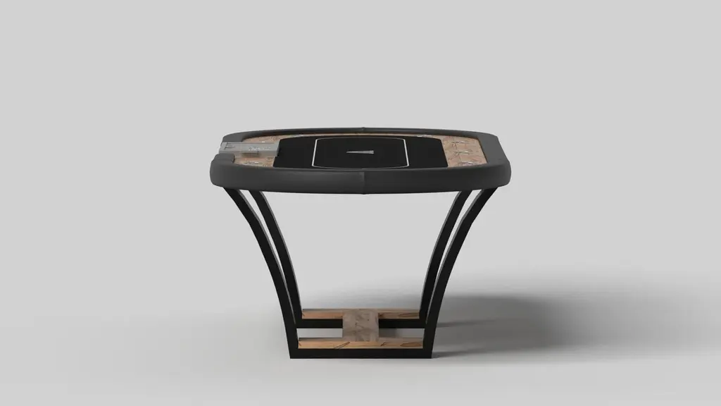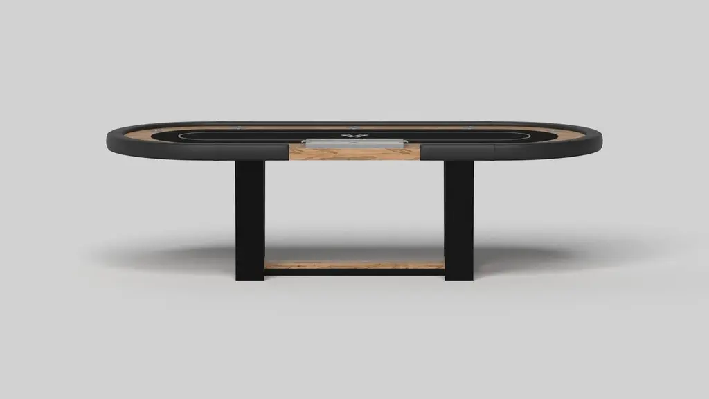 With an I-shaped metal base, slightly sloped metal legs, and a contrasting wood top, the Elite poker table exudes modern sophistication while evoking a sense of art deco design. This table is a confluence of style, made to meet today's demands and appeal to tomorrow's sense of style, while also harkening back to the past.Size:104”X44”X30”Custom Sizes Available Per RequestCustom Table-Top Shapes Available Per Request
