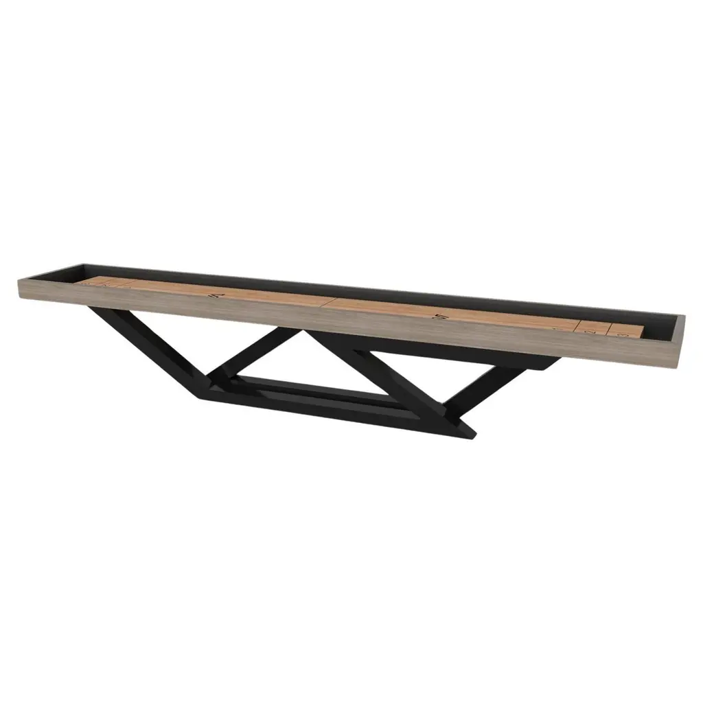 Inspired by the work of Antoni Gaudi and the movement of Catalan Modernism, the Draco shuffleboard table in Walnut boasts bold style with smooth, curved legs and a rich smooth professional grade Maple wood surface surface for professional game play. Expertly crafted from Walnut wood, this table features a high-end, contemporary design in a black finish with stark white accents.Size:22 Foot - 264”X32”X34”Playing Area Of 248”X20”